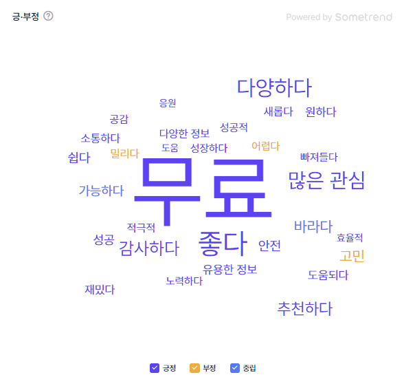 긍부정어 분석을 보면 긍정어가 눈에 띄게 많이 보입니다. 다양한 정보로 도움을 얻기 위해 적극적으로 구독하는 모습을 볼 수 있죠.