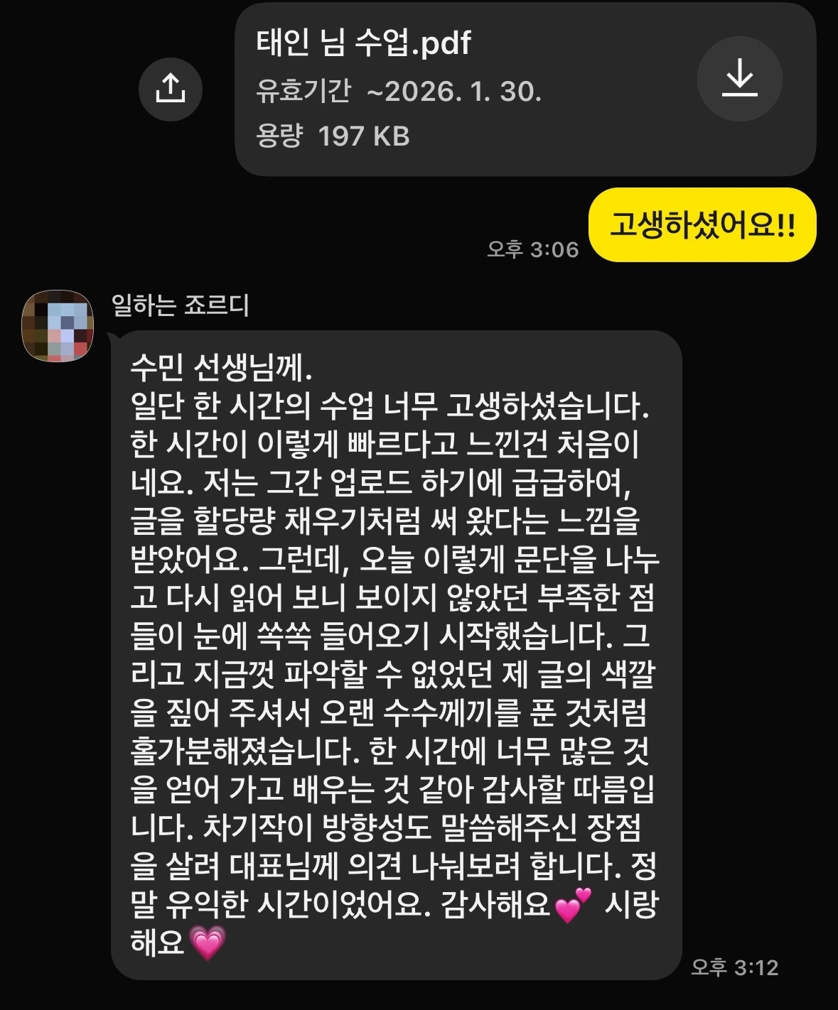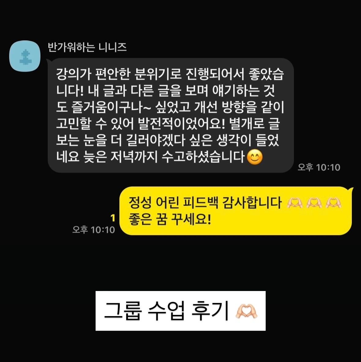 - 1:1 수업: 합평 수업보다 더 개인에게 집중되며, 개인의 색을 더 존중하는 선에서 집중 코치를 합니다. 수강생이 약점이라고 느껴지는 부분을 집중적으로 개선시키도록 적합한 과제를 내 주는 것은 당연합니다. 저는 글에 자신감이 없다 하여 근거 없는 칭찬을 늘이지 않는 편이에요. 수강생과의 관계에서 신뢰가 깨질 수 있다고 생각해서요. 다만 창의성과 표현력, 어투, 구조와 흐름, 감정과 메세지 전달 같은 부분에서 좋은 부분이 있다면 솔직하게 피드백을 해 줍니다. 단점도 기분 나쁘지 않도록 전달하고, 최대한 수강생을 존중해요.