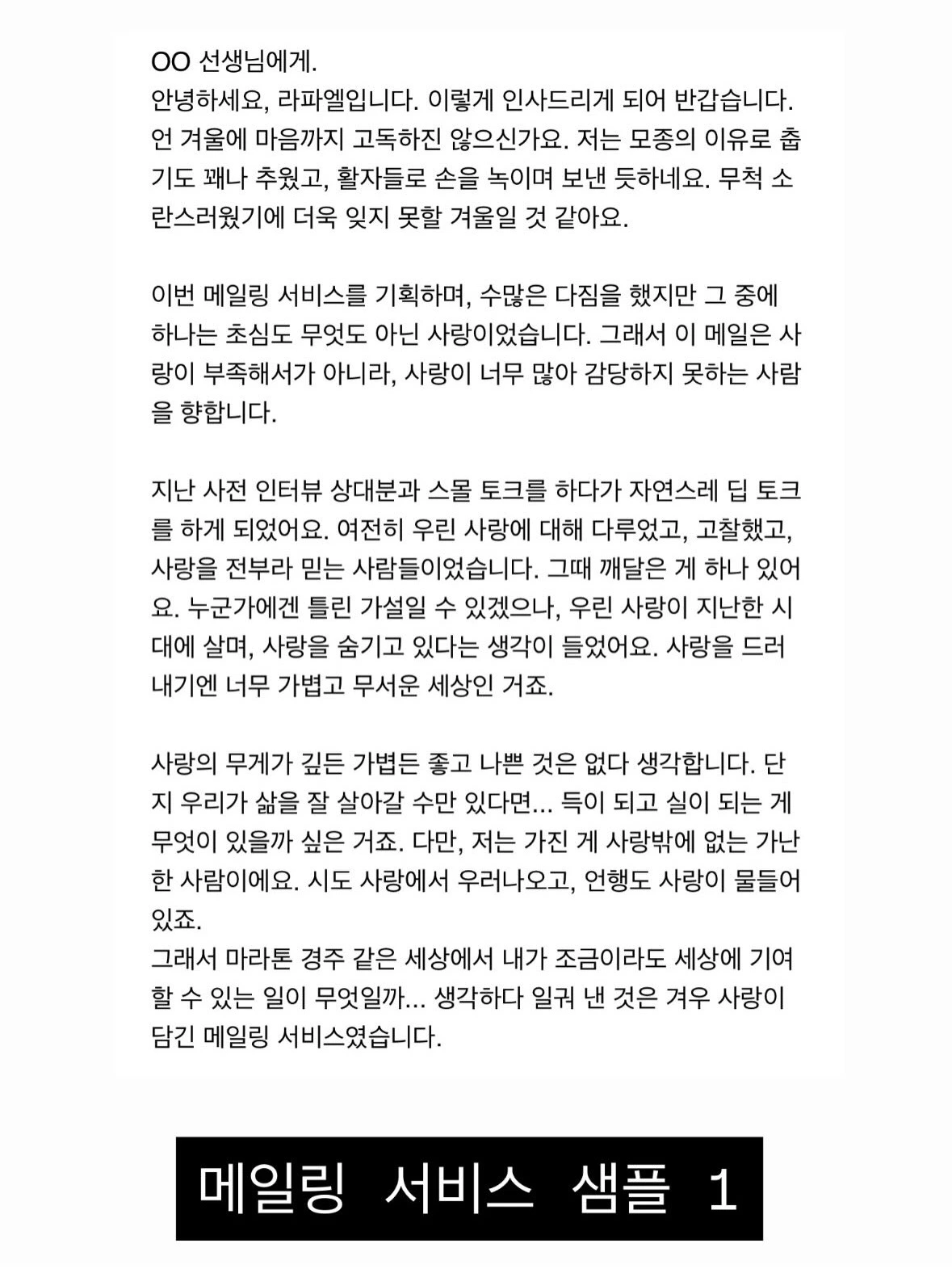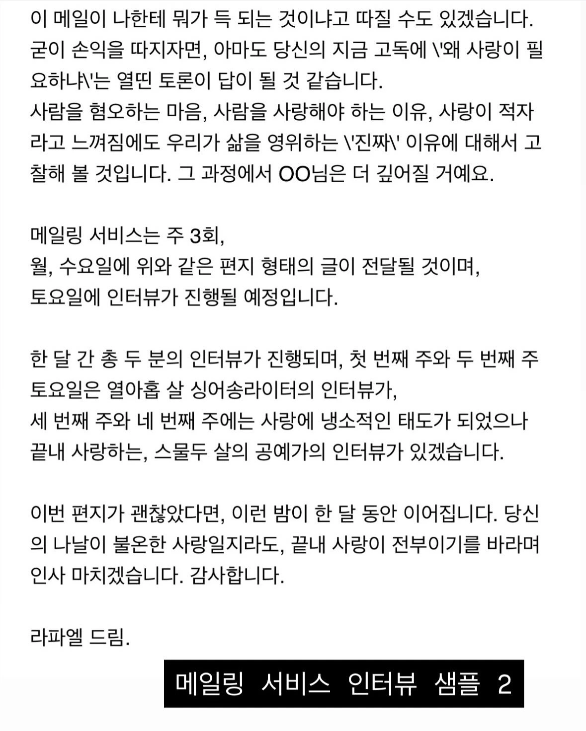 기존에 *메일링 서비스*로 연재될 예정이었던 것을 카카오톡 채널로 이전하였습니다. 여러분께서는 메일링이 아니라 카카오톡을 통해 주 3회, 선물 박스에 담긴 사랑을 뜯어 보실 수 있습니다. 이 사랑은 오롯이 여러분 것입니다. 여러분을 위해 주마다 작성되는 편지 두 편과 한 개의 인터뷰가 들어가 있습니다.
