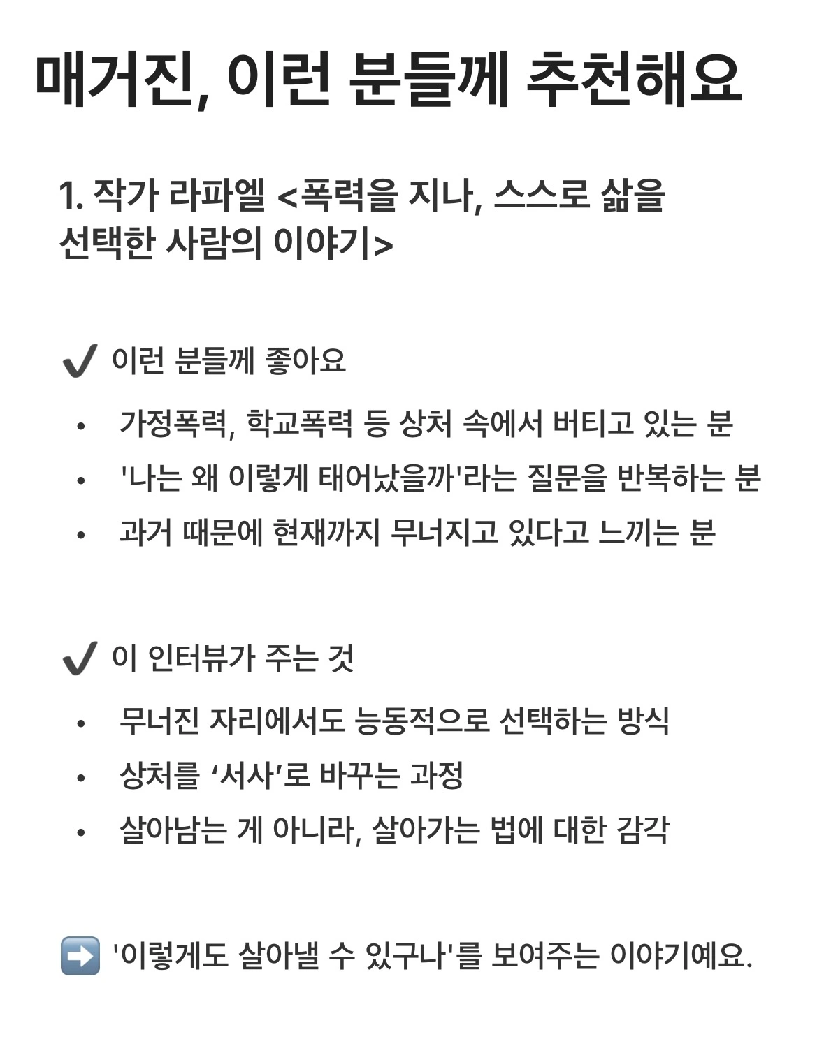매거진은 실제 사람들의 이야기를 담은 인터뷰 형식의 글입니다. 누군가의 삶을 깊이 들여다보며, ‘나만 이런 게 아니라는 걸 깨닫고, 통찰을 얻을 수 있습니다.