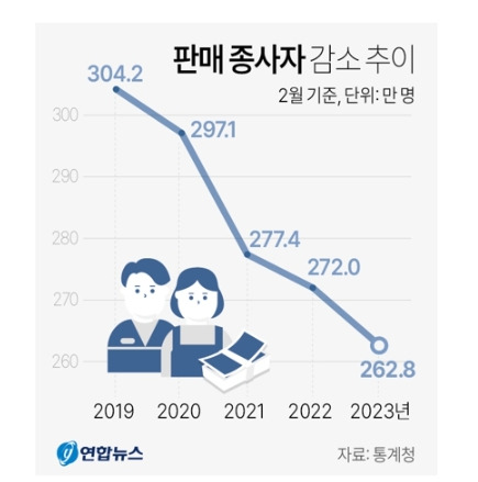판매 종사자 감소추이, 출처-통계청 외 언론매체