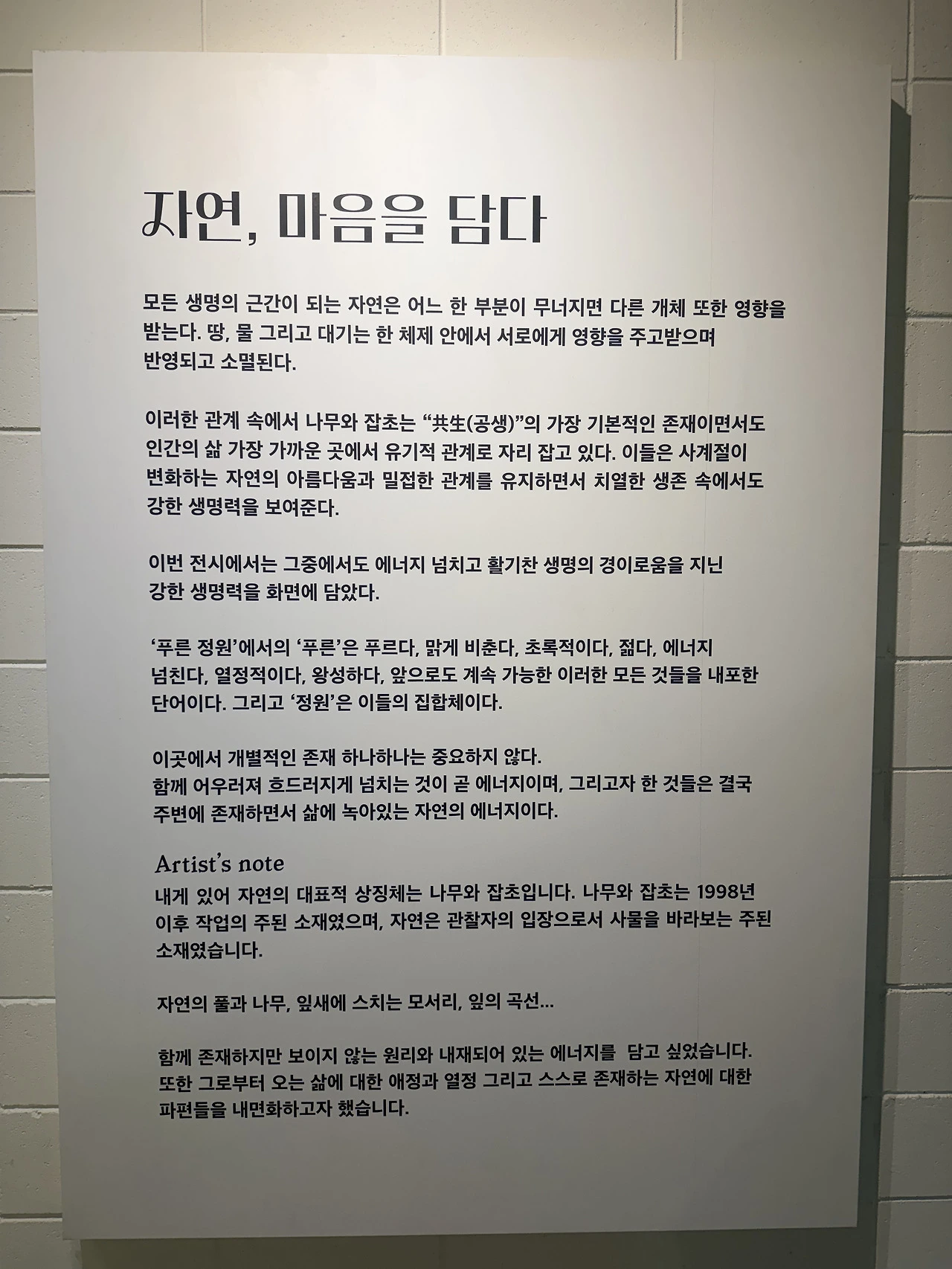 이번 전시는 나무와 잡초 속에서 열정과 에너지를 느낀 작가님의 작품들이다.