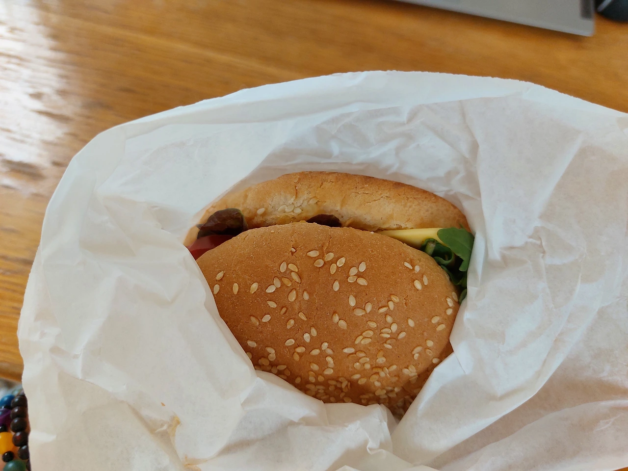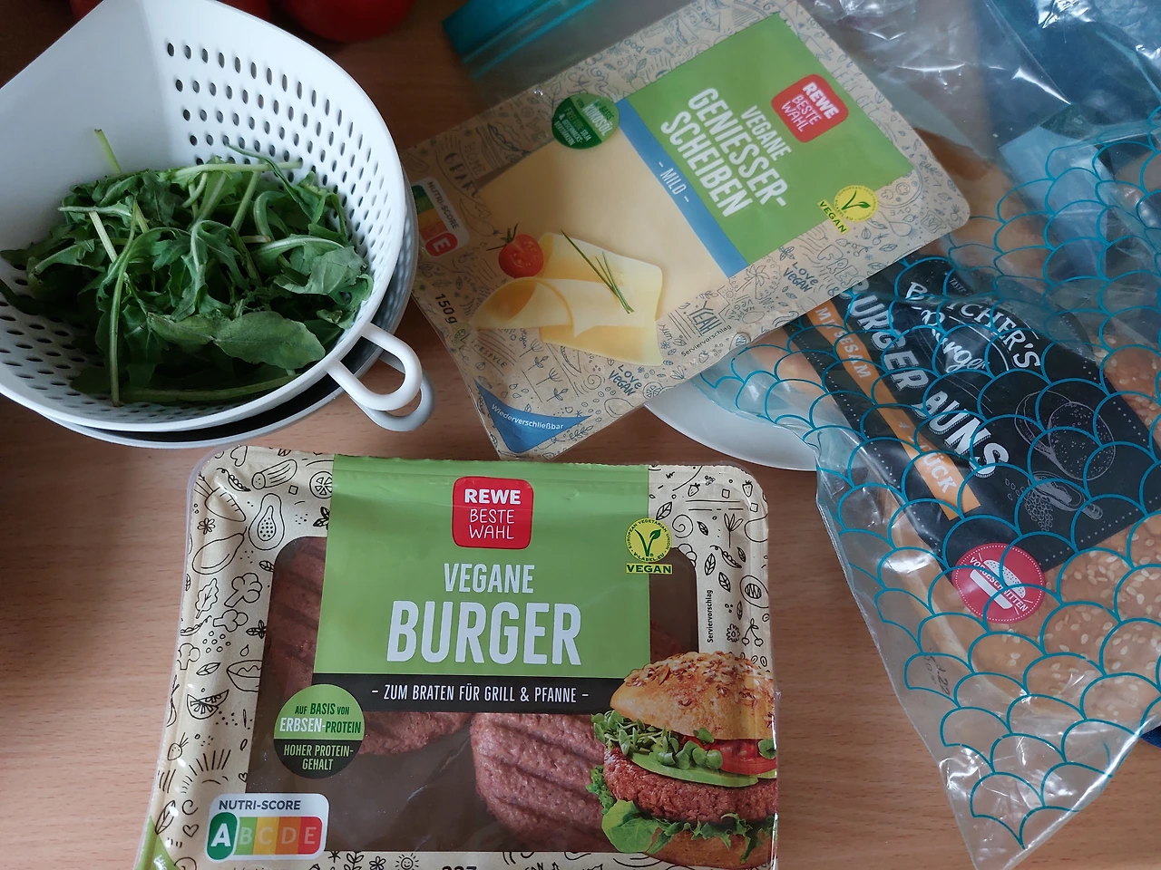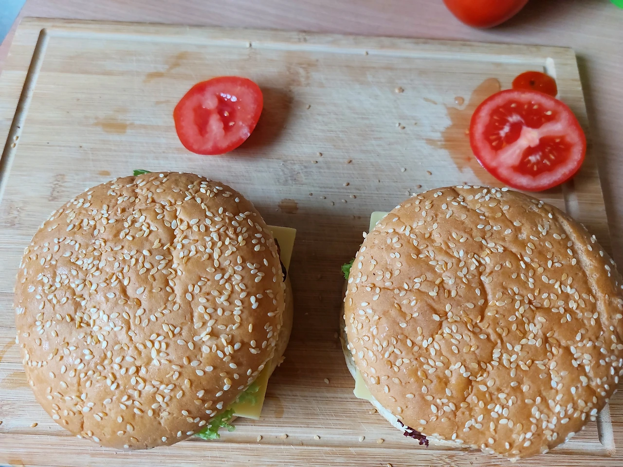 재료: 비건 버거 번, 비건 버거 패티, 비건 치즈, 루꼴라, 토마토