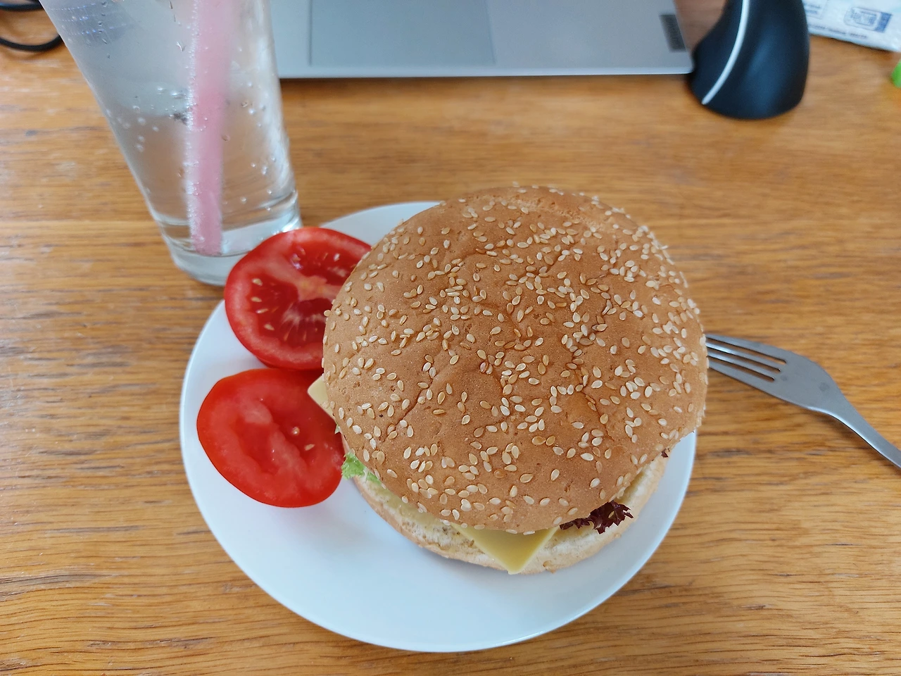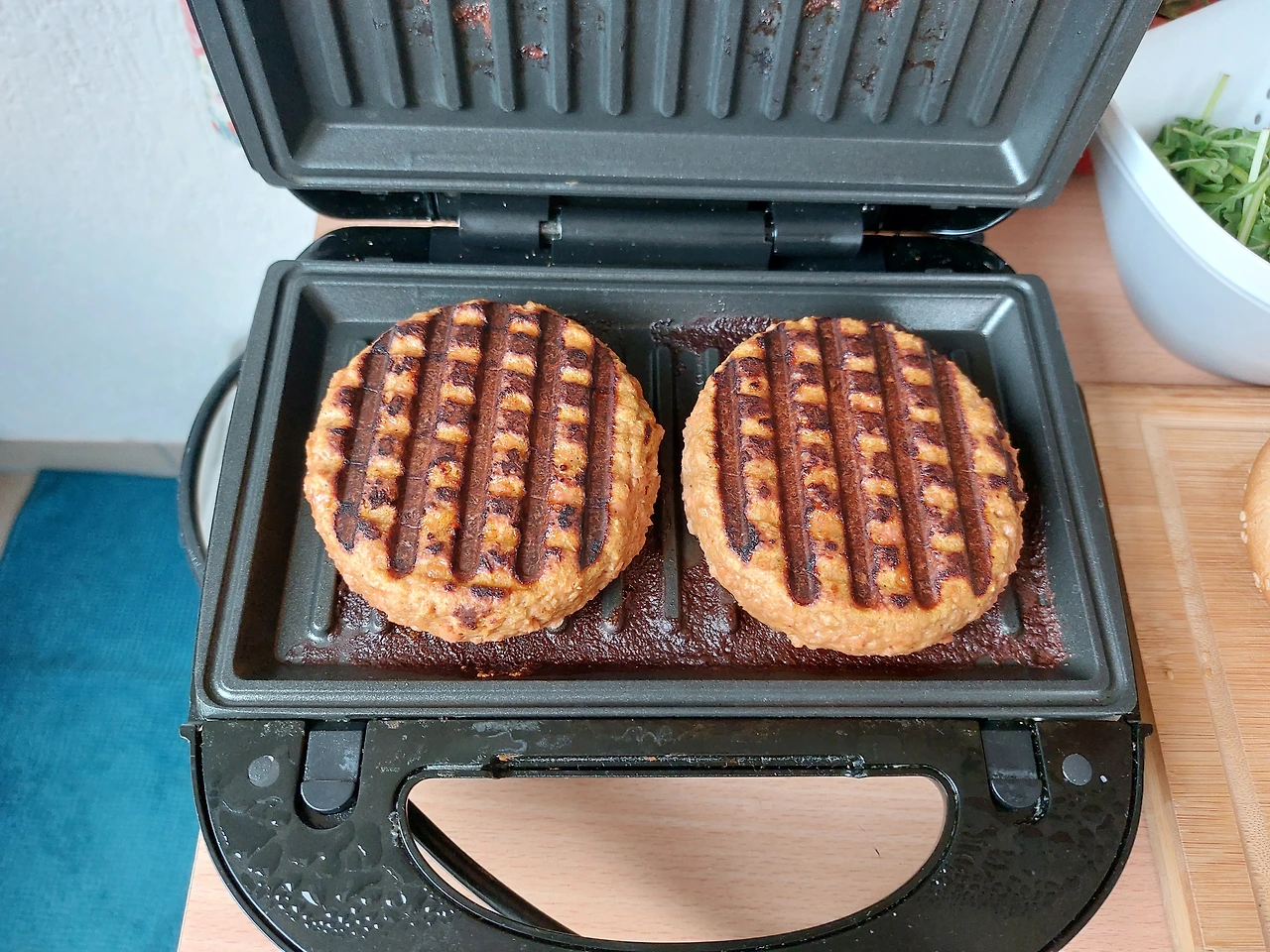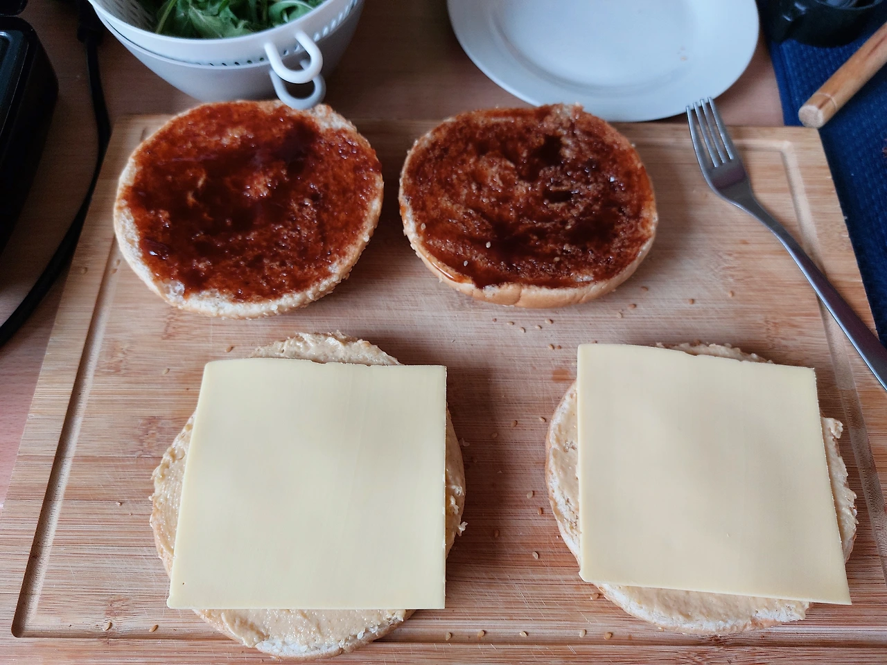 재료: 비건 버거 번, 비건 버거 패티, 비건 치즈, 루꼴라, 토마토