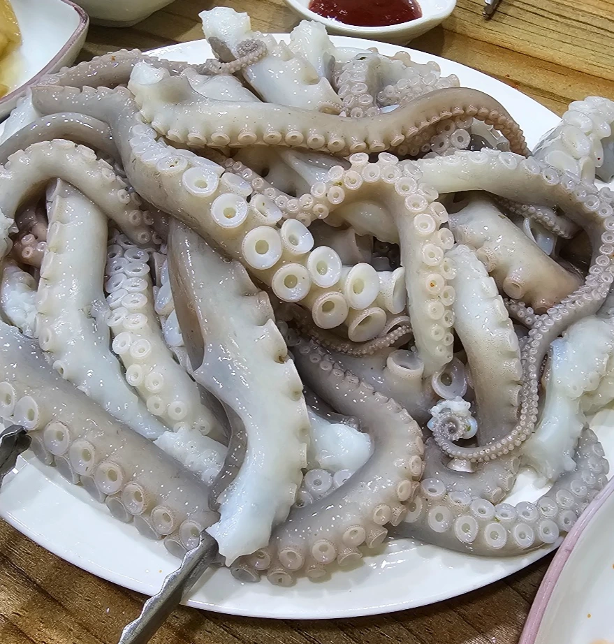 여태껏 이렇게 큰 낙지를 본 적이 없다. 살아있는 낙지 세 마리를 손가락에 걸고 뜨거운 육수에 여러 차례 담그고 데치기를 여러 번 하다 머리 부분만 잘게 잘라 김과 야채를 넣고 죽을 끊였다. 데친 낙지는 다리만 잘라 커다란 접시에 놓았다. 다리가 길지만 그냥 입으로 잘라서 먹으면 잘라진다 했다. 절대 초장을 찍지 말고 먹어야 낙지 본연의 맛을 느낄 수 있고 씹다 보면 끝맛이 달다 했다.