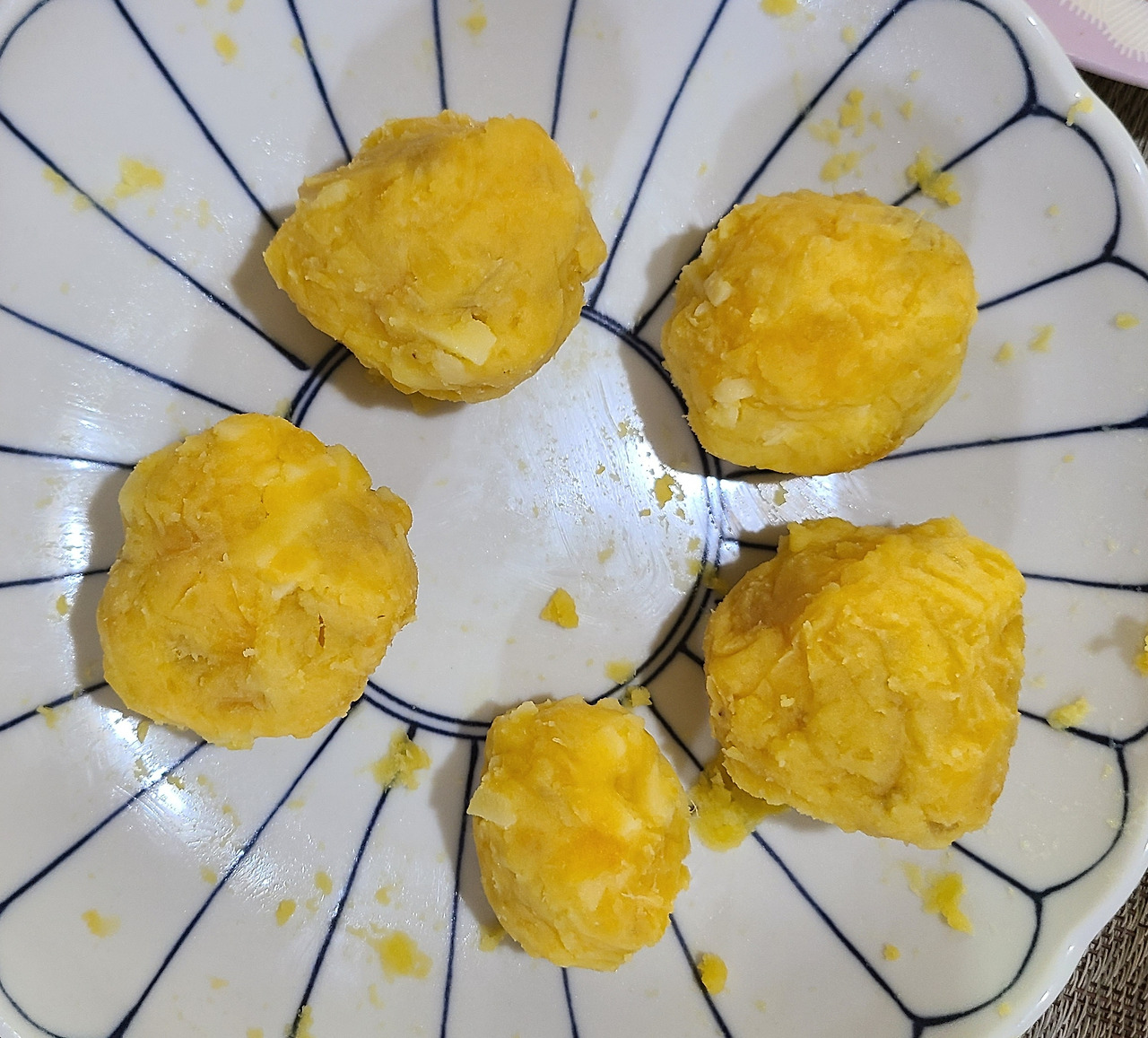 1. 우유를 조금 넣은 으깬 고구마 반죽에 모차렐라 치즈를 넣고 동그랗게 뭉친다.