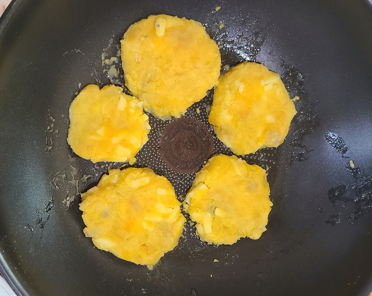 2. 프라이팬에 올리브유를 살짝 두르고 반죽을 넓적하게 눌러 펴서 노릇하게 약불로 굽는다.