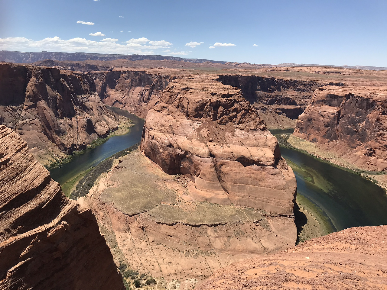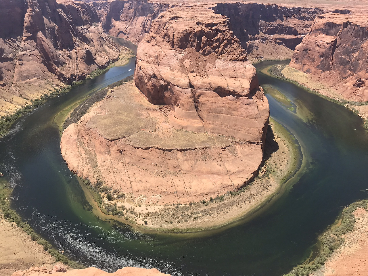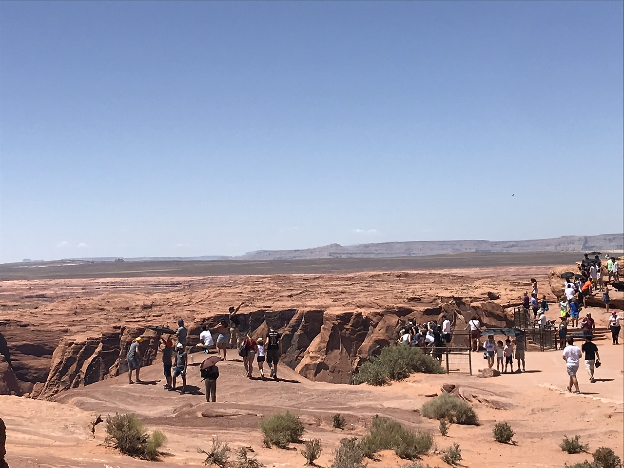 - 드디어 도착! 정말 딱 쓰러지기 직전이었다. 너무 눈이 부시고 뜨거워서인지, 무서워서인지, 제대로 쳐다볼 수가 없었다. 엄청난 홀스슈 밴드는 콜로라도강이 말발굽 모양으로 휘감아 돌며 장관을 만드는 지형으로 한번쯤 사진에서 보았을 곳이다. 실제로 그 앞에 가보니 사진으로는 담기지 않는, 거대하고 장엄한 풍경이었다. 아찔한 깊이에 굽이치는 강의 빛이 너무 예뻤다. 제일 뜨거운 오후 1시쯤 가서 후회했는데, 알고 보니 그 시간대에 그림지 없이 사진이 제일 예쁘게 찍힌다고 한다.