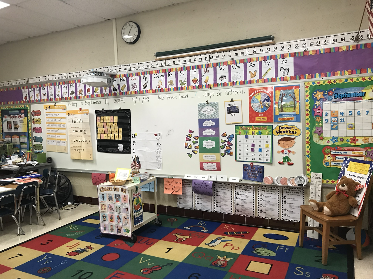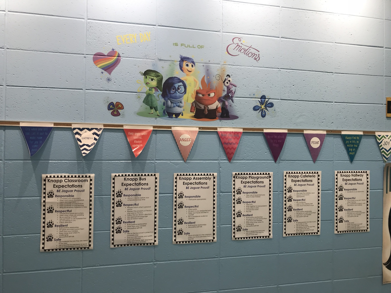 타인을 존중하고 배려하는 것, 안전을 위한 행동 지침을 각 영역별로(식당에서, 교실에서, 운동장에서, 스쿨버스에서....) 교실과 복도 군데군데 게시해 놓았고