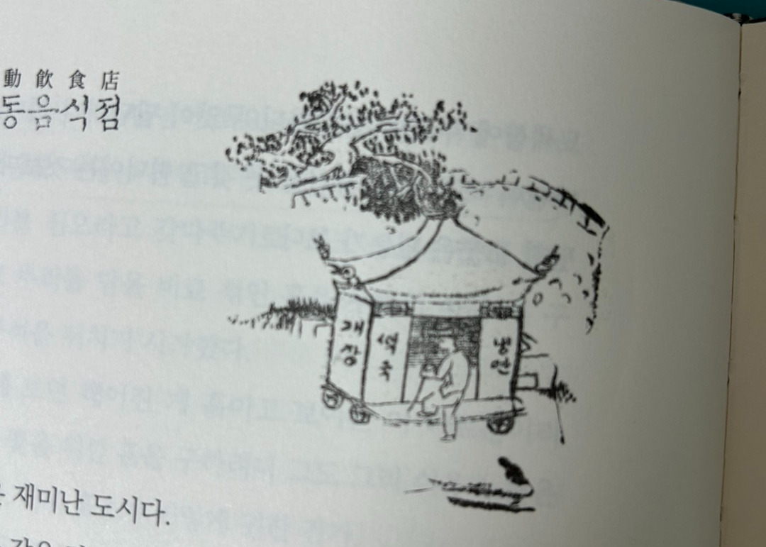 ‘골동품 같은 집’이 있는데, “추녀 끝에는 방울 같은 새를 앉히고 납작한 완자창도 달았다.” 떡국과 냉면, 개장국을 파는 곳으로 “재미난 것은 주추 대신에 도롱태를 네 귀에 단 것”이라며 신기해하는데, 이 역시 재민의 살아가는 방식이므로 마찬가지로 풍자적 시선을 감지할 수 있다.
