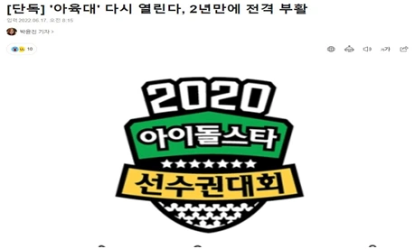 2019년 터진 코로나로 인해 많은 인원이 모여야 하는 촬영이 불가능해지면서 아육대도 자연스럽게 막을 내릴 거라고 많은 사람이 추측했다. 그런데 웬걸 이번 추석에 아육대가 부활한다는 소식이 떴다. 이 소식을 들은 아이돌 팬들은 너무 좋다고 꼭 내 아이돌이 출연했으면 좋겠다고 하는 쪽과 다칠까 걱정되고 방송에 별로 나오지 않을 것 같으니 출연하지 않았으면 좋겠다고 하는 쪽으로 상반된 반응을 보였다. 그래서 이번에 열리는 아육대에서 부상 위험 정도가 낮은 종목을 채택하여 경기하고 아이돌별 경기, 비하인드 편집본을 올리면 부정의 시선으로 아육대를 바라보는 아이돌 팬이 현저히 적어질 것 같다.아이돌 프로그램의 레전드라고 불리는 아육대가 더 사랑받았으면 좋겠다.