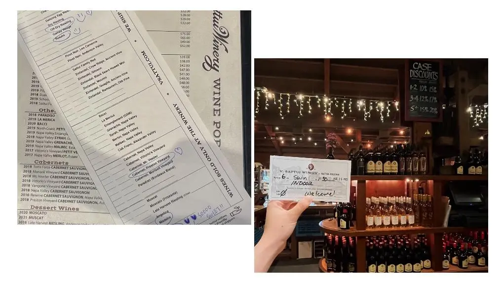 얼큰하게 취해 두 뺨이 붉어진 채 중세시대처럼 아기자기하게 꾸며놓은 다음 와이너리로 이동했다. 이쯤부턴 뇌의 사고회로가 멈춘 듯 아무런 생각도 없이 신나기만 했던 것 같다. 연신 즐겁다고 외치며 여기서 시음하고 나면 글을 작성할 기억이 남아있을지 모르겠다고 조교님이랑 장난쳤던 게 유독 생각난다. V. 사뚜이에선 굉장히 긴 와인 리스트를 주고, 개인별로 종이에 동그라미 표시를 함으로써 각자 선호대로 다섯 가지 와인을 고를 수 있었다. 시음 순서도 마음대로 할 수 있었는데, 각 잔을 마시고 나면 왼쪽 사진처럼 와인 명 옆에 맛있었던 만큼 하트나 웃는 얼굴 같은 기호를 그려놓아야 했다. 귀여운 아이디어라고 느껴졌다.