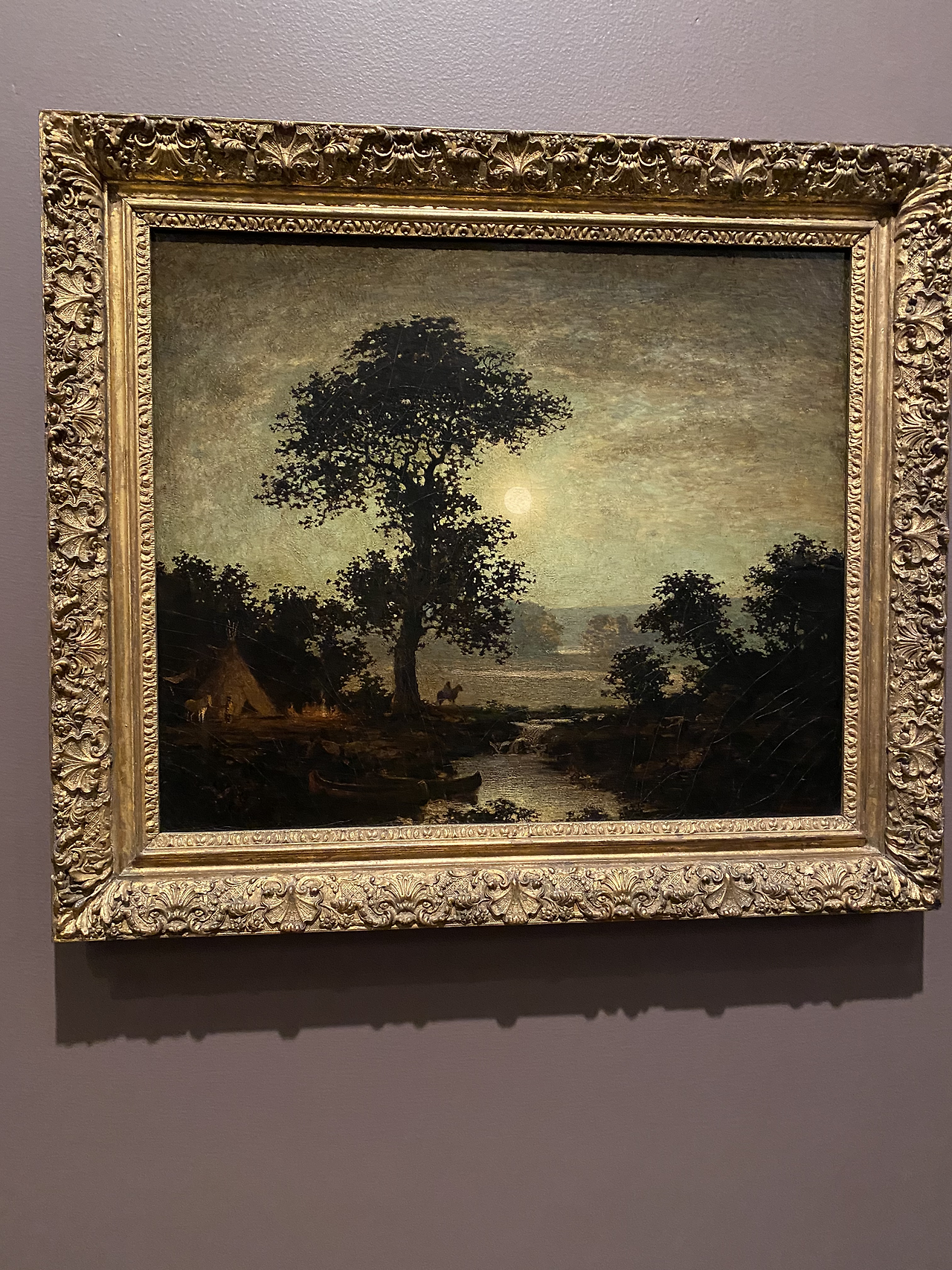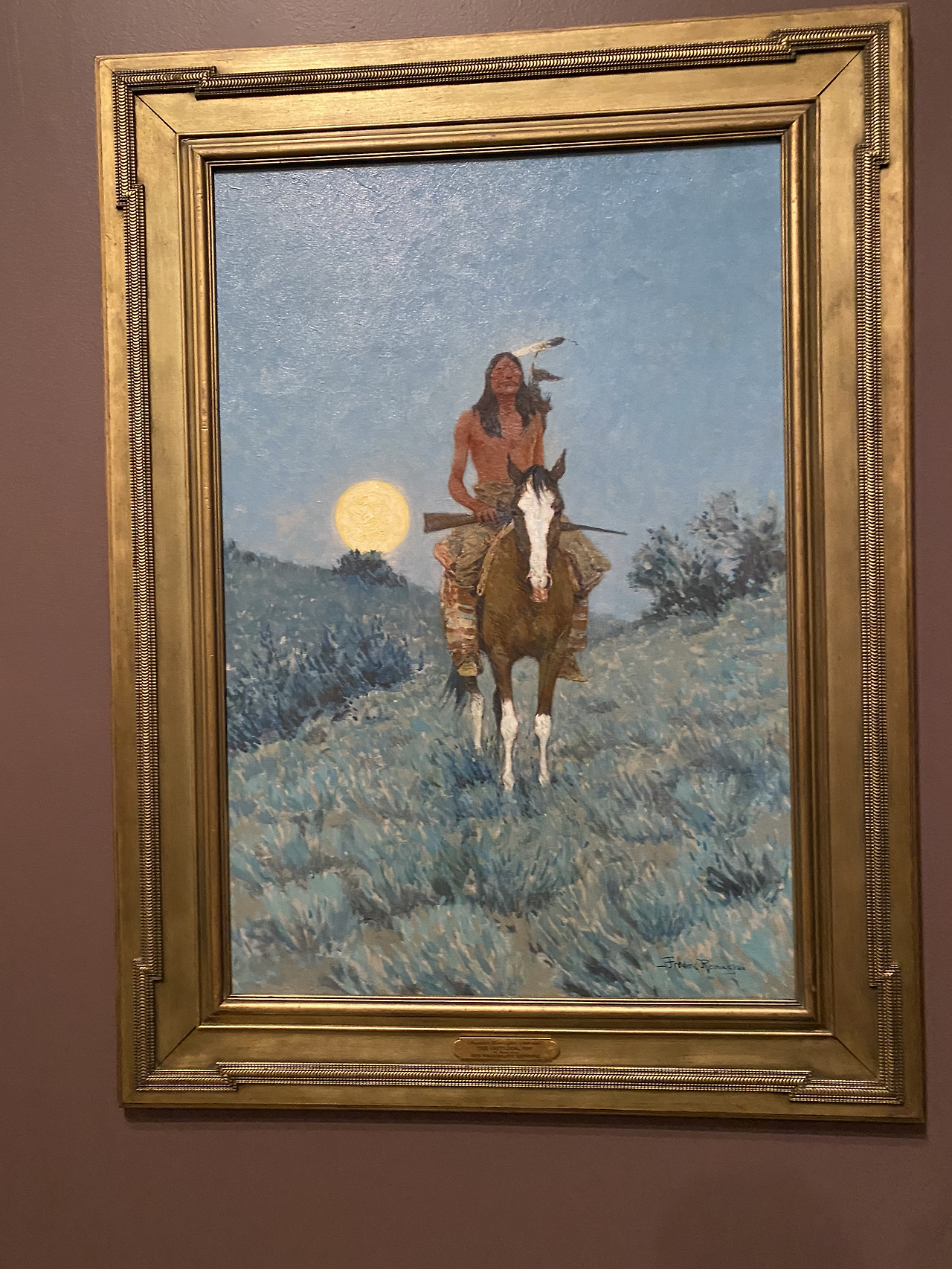 방금 사냥을 마치고 온 듯한 원주민의 모습이다. 인물의 표정이 세세하게 묘사되어 있지는 않아서 기분이나 상태를 추측하긴 어렵지만 성공적인 사냥은 아닌듯하다. 밝은 달이 인물의 감정과는 대비되어 보인다. 마치 날씨 좋은 날 기분이 좋지 않을 때 그럴 때 감정이 더 고조된다. 어쩌면 사냥꾼이 아닌 마을을 지키는 용사일 수도 있다.