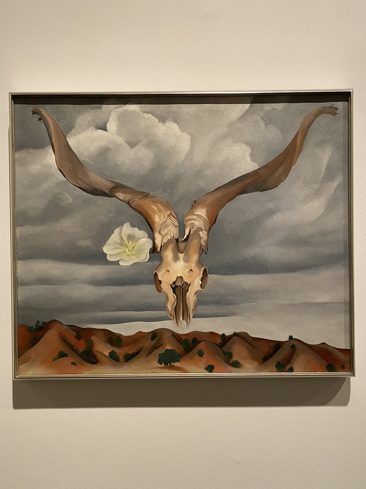 조지아 오키프의 작품이다. 그동안 봐왔던 오키프의 작품과는 다르게 색감이 어둡고 암울한 기운이 느껴진다. 동물의 형상과 작은 꽃, 뒤를 채우는 배경이 조화로우면서도 이질적인 느낌이 든다.