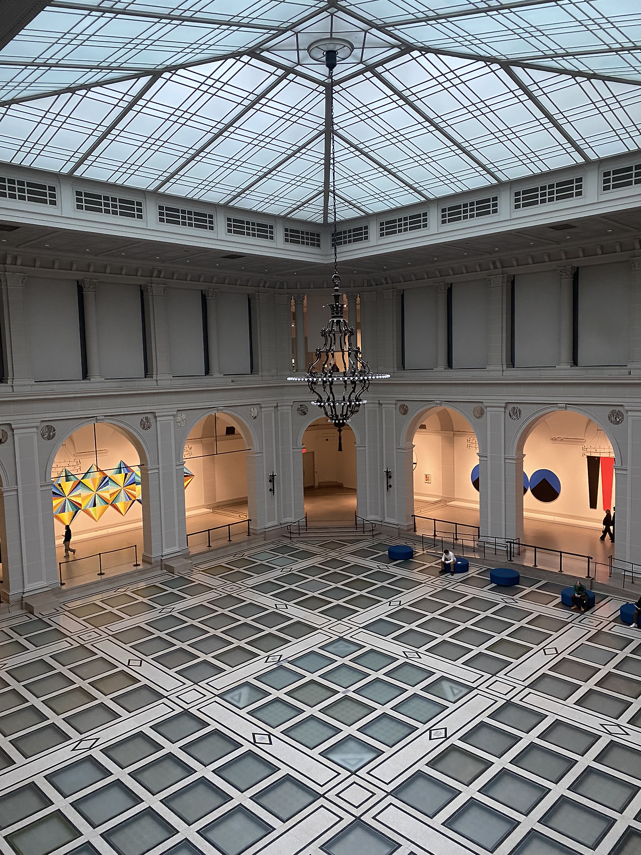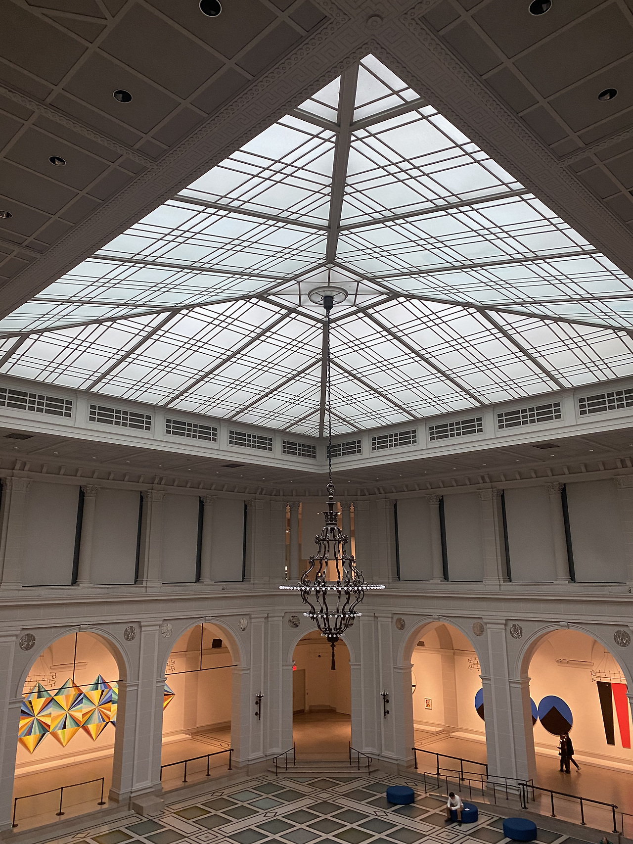위에서 내려다본 브루클린 미술관의 모습이다. 미술관의 천장이 유리로 되어있다. 빛이 통하는 유리창을 미술관 내부에 설계하는 이유는 안과 밖, 실생활과 예술의 경계를 허문다. 개방성과 투명성을 강조하여 건물도 하나의 예술 작품으로 여겨진다. 감상자에게 더 강한 인상을 남기기 위해 작품 전시 공간의 설계는 작품만큼이나 중요하다.