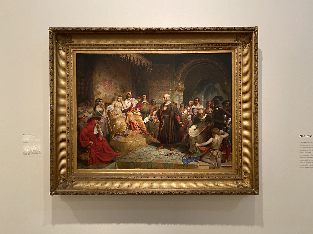 여왕 앞에 선 콜럼버스의 모습을 그린 작품이다. 그의 위풍당당한 자세와 이와는 상반되는 여왕의 자세가 콜럼버스의 위엄을 드러낸다. 실제로 콜럼버스가 해항을 떠나기 전에 국왕에게 허락을 받아야 했던 상황이 있었다.