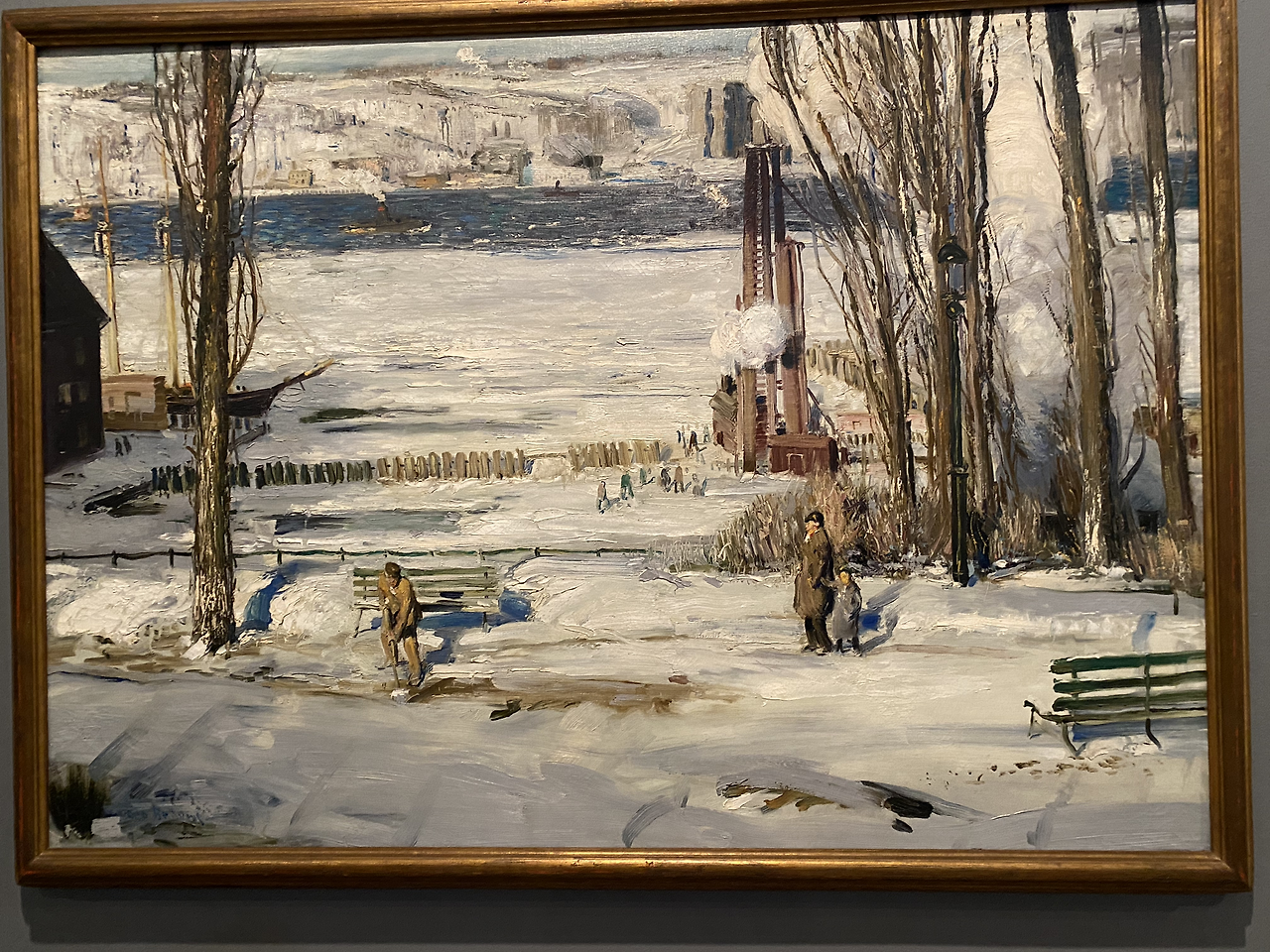 눈 내린 어느 날을 그린 작품이다. 강가 뒤 흐릿하게 보이는 건물들이 공업 도시의 분위기를 자아낸다. 눈 덮인 날에도 얼지 않고 흐르는 강 위의 배와 건물들이 겨울에도 뜨겁게 달리는 도시의 열정을 담아낸다.