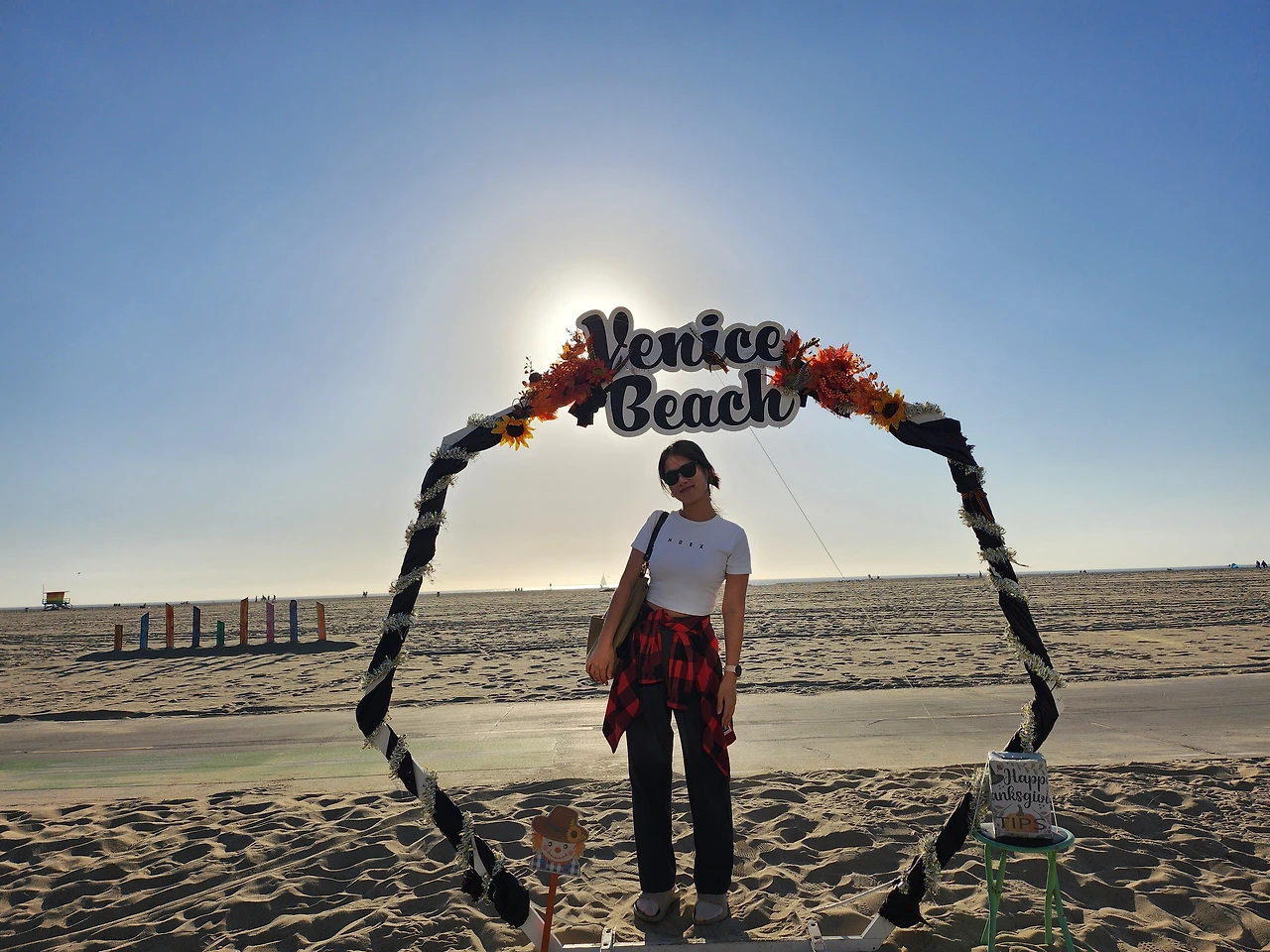 여행 마지막 날이었다. 마지막 날이 추수감사절이라 샌타모니카에서 가고자 했던 가게들이 죄다 문을 닫아 어디를 가야 할지 갈피를 잡지 못하고 우왕좌왕하고 있었다. 계획에는 없었지만 가까운 거리에 베니스해변이 있었고 그곳을 가기로 그 자리에서 결정했다. 나에게는 샌타모니카 해변만 익히 들어 익숙했지 베니스 해변은 생소했다. 그래서 애초에 갈 생각조차 안 했는데 들르지 않았으면 어쩔 번 했겠는가! 정말 입이 떡 벌어질 정도로 좋았다. 드넓은 해변과 영화에서나 볼 법한 해변가의 가게들과 자유로운 영혼을 가진 현지인들과 관광객들. 그들 사이에 신기하게도 한국인이 안보였다. 그래서 정말 해외여행을 온 기분도 들었고 마지막날임에도 불구하고 여행의 시작과 같아서 설렜었다. 상의를 탈의한 채 스케이트 보드를 타는 젊은 청년들, 길거리에서 흑인 소울 가득 담아 버스킹을 하는 이들, 자전거를 타며 한껏 여유를 즐기는 사람들. 그저 바라만 봐도 행복했다. 정말 여유가 느껴졌다. 그렇게 사람들을 바라보다 포토존을 발견하고 사진을 찍었다. 나를 찍을 수가 없어 그 장소만이라도 기록하기 위해 예쁜 구도를 찾으며 열심히 찍고 있었다.