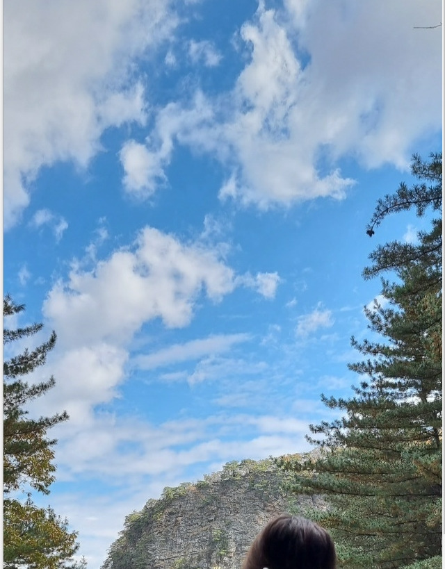 조금 오르니 구곡폭포로 가는 길과 문배마을로 가는 길로 나뉜다. 구곡폭포는 내려오는 길에 보기로 하고 먼저 문배마을로 향한다. 경사가 꽤 가파른 길을 따라 오르다가 주변을 둘러보니 사진을 안 찍을 수가 없다. 한없이 파란 하늘과 조화로운 절벽의 풍광은 사진으로 다 담을 수가 없다. 눈으로만 보기 아까워 핸드폰 사진으로 담아보려고 노력하지만 실제 풍경을 그대로 옮기기는 역시 무리이다. 경사가 있는 길이지만 지인들과 중간중간 사진을 찍으며 올라가니 등산도 아니고, 산책 수준도 되지 못한다. 산 꼭대기도 아닌 언덕에 오르니 뭐랄까, 우리가 올라온 길이 꼭 절벽같이 느껴진다. 이 가파른 길을 다 올라왔더니 꽁꽁 숨겨진 마을과 호수가 내려다 보인다. 몇 가구 되지 않는 그곳은 신 씨, 장 씨, 김 씨 등 각 가구들마다 사는 이들이 달라 각 집마다 성을 붙여서 쉽게 불렀단다. 지금은 그 가구들이 거의 식당들이다. 나는 그 밥을 먹기 위해서 올라온 것이다.