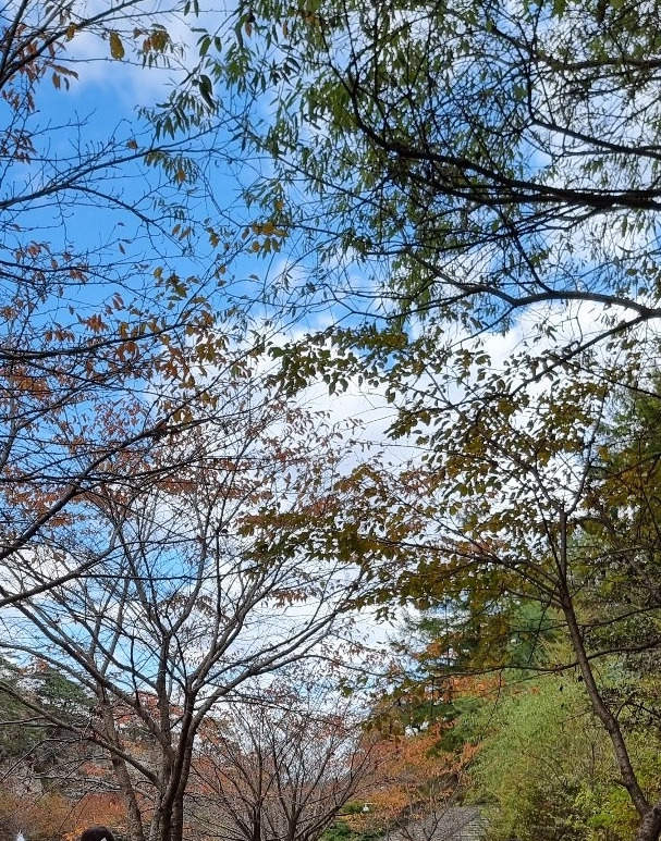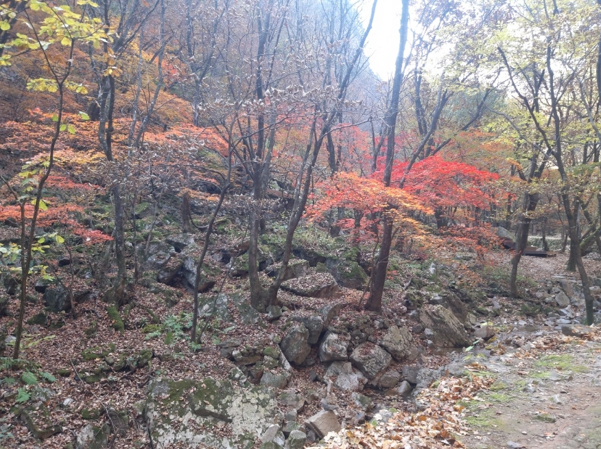 가을 끝자락이었다. 몇 년 전 함께 수영을 배웠던 언니와 동생 셋이서 평일에 휴가를 내고 만났다. 별내역에서 만나 강촌역까지 전철을 타고 갔다. 역시 단풍철인가, 평일인데도 전철 안에는 꽤 많은 사람들이 있었다. 강촌역에서 내려 핸드폰의 어플을 켜고 걷기 시작했다. 몇 분 지나 구곡폭포 입구에 도착하였다. 입장료가 있었는데, 춘천 내에서 사용할 수 있는 상품권으로 바꿔 주었다. 길이 잘 닦인 인도로 주욱 올라가니, 양 옆으로 쨍하니 찬란한 단풍잎들이 눈에 들어온다. 초록, 주황, 갈색의 조화가 어우러진 잎들을 보니 자연의 색이란 이런 거구나 싶고. 가을이어도 초록색이 함께이지 않으면 더 예뻐 보일 수가 없는 이유도 알 것만 같다. 조금 걸으니 이끼정원도 보이고 계곡물도 졸졸 흐르고. 금세 눈이 맑아지고 마음이 차분해진다.