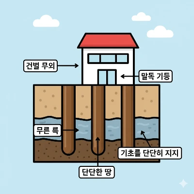 업무에 들어가면서 알게 되었습니다. '와 진짜 제대로 일 할 수 있는 인력이 전멸한 상태네?'라는 것을 말이죠. 그 어떤 것도 알지 못했기에 그의 입에서 나온 모든 말은 구라의 바다로 흘러갔습니다. 몇 가지 에피소드를 적어보겠습니다. 땅이 단단한 경우에는 그 위에 바로 구조물을 올립니다. 어차피 지반이 구조물에 의해서 눌린다고 해도 버틸 수 있는 상태이기 때문입니다. 반면 지반이 단단하지 못한 경우에는 구조물 하부에 말뚝을 깊게 심고, 깊게 싶은 말뚝이 깊은 심도의 단단한 지반층에 박히게끔 계획을 합니다. 그렇게 하게 되면 지반이 무르다고 해도 말뚝으로 구조물의 무게가 실리고 그것이 단단한 지반층으로 넘어가게 되는 거죠.