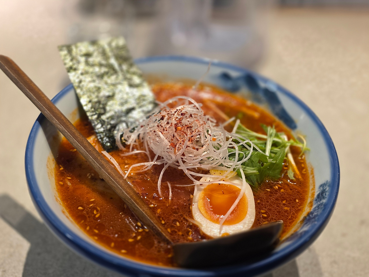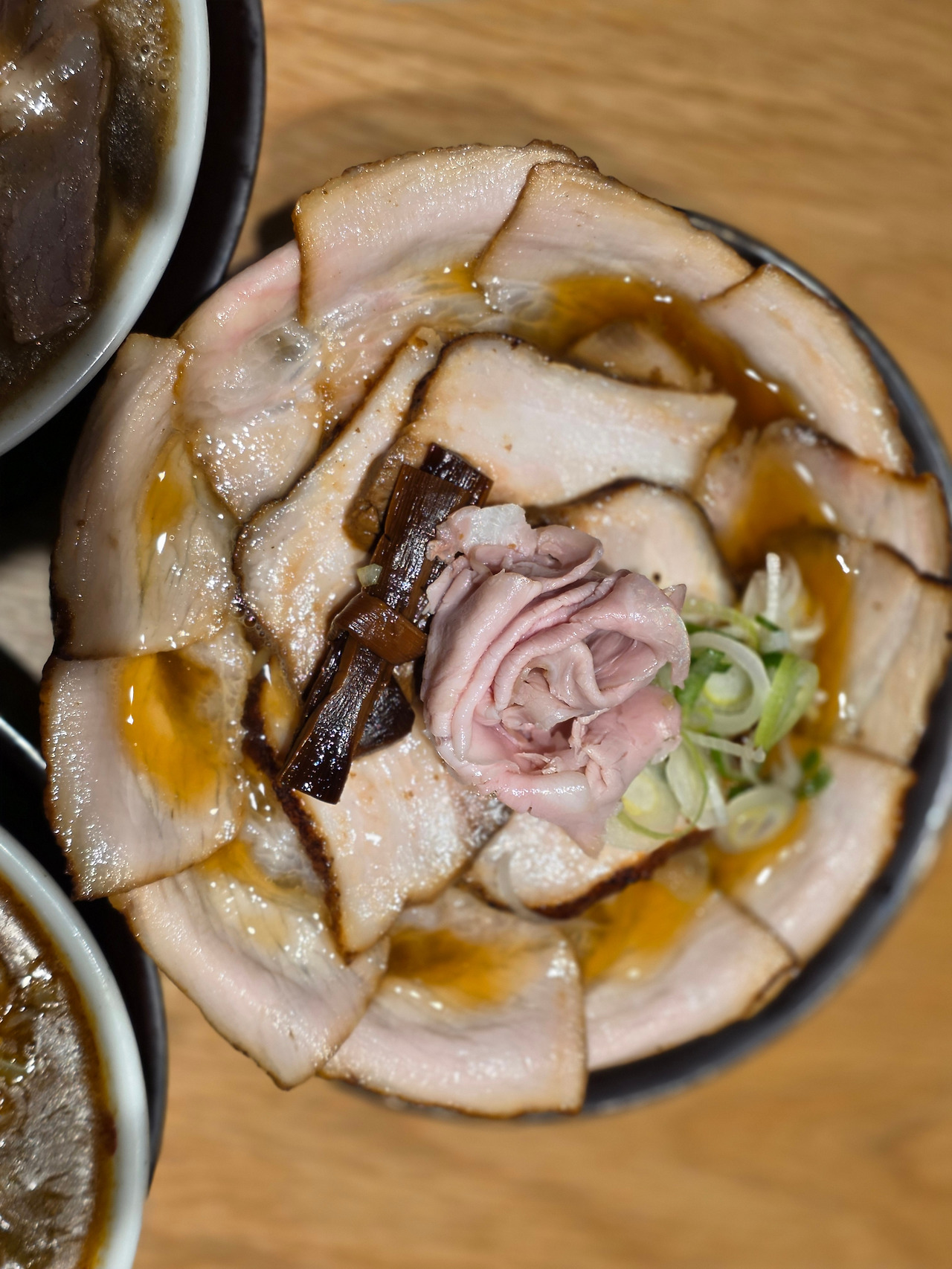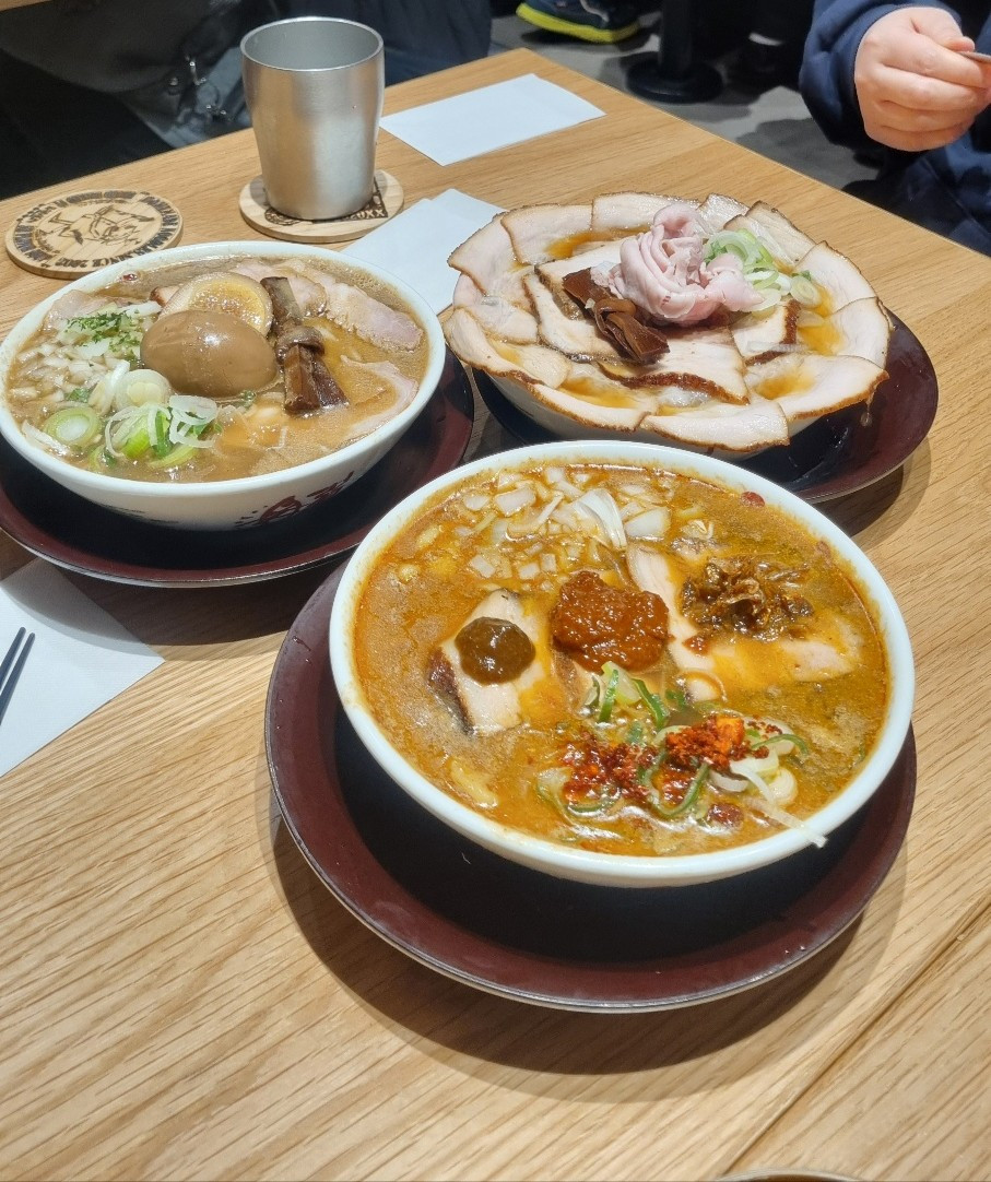멸치 육수 베이스에 엄청 짠 라멘인데.. 이 또한 지금까지 맛 본 적 없는 라멘이었다. 달걀이 올라간 건 멸치 육수+미소된장 같았고, 장미꽃모양 삼겹살이 잔뜩 올라간 차슈라멘은 멸치+간장 베이스, 빨간 국물은 매운 맛을 멸치 육수에 섞은 맛 살짝 맵다.