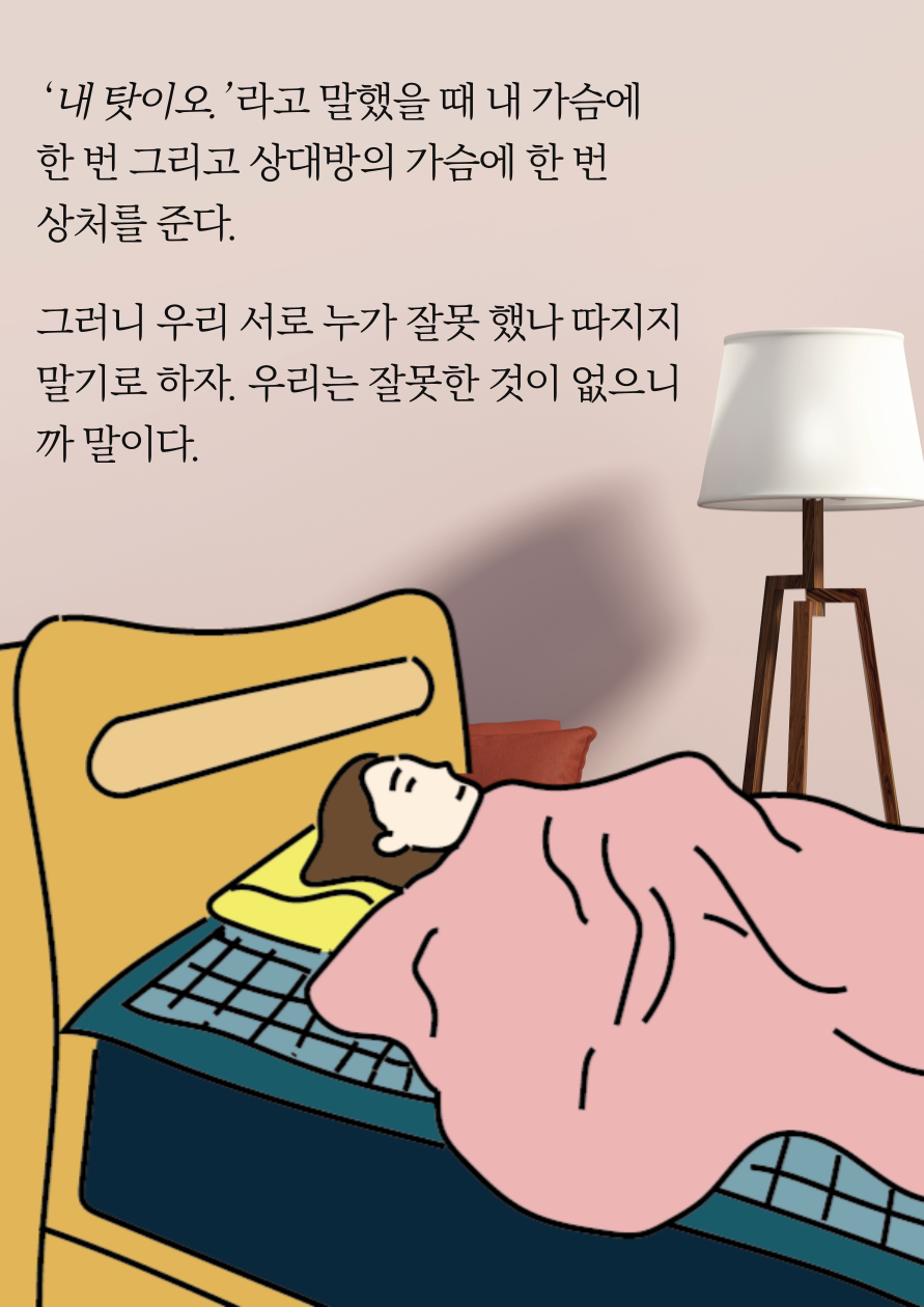 모든 자식 둔 부모의 마음이 그럴 것이다. 자식이 아프면 모두 내 탓인 것만 같고 더 잘해주지 못해 미안한 마음 말이다. 하지만 그런 부모 마음에 자식들 또한 이런 마음일 것이다, ‘부모님은 아무 잘못 없어요.’라고. ‘내 탓이오.’라고 말했을 때 내 가슴에 한 번 그리고 상대방의 가슴에 한 번 상처를 준다. 그러니 우리 서로 누가 잘못했나 따지지 말기로 하자. 우리는 잘못한 것이 없으니까 말이다.