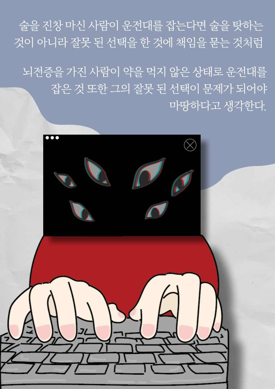 술을 진창 마신 사람이 운전대를 잡는다면 술을 탓하는 것이 아니라 잘못된 선택을 한 것에 책임을 묻는 것처럼 뇌전증을 가진 사람이 약을 먹지 않은 상태로 운전대를 잡은 것 또한 그의 잘못된 선택이 문제가 되어야 마땅하다고 생각한다.