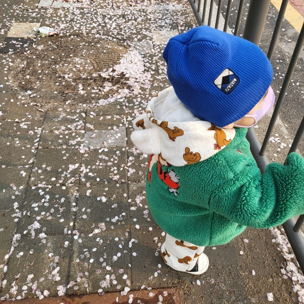 목요일은 아기부모가 아침 열 시 반에 나갔다. 아침밥을 먹이고 엄마가 화장하는 옆에서 같이 화장도 톡톡했다. 아기는 어린이집 가서 카드 찍고 하이파이브만 하고 온다. 엄마랑 할머니랑손 잡고 어린이집 다녀와서 엄마가 나가니 아기 기분이 나쁘지 않다. 그런데 자꾸 밖으로 나가 자고 한다. 4월이 되어 겨울 동안 꺼졌던 분수가 나오는 것을 본 아기의 말이 "우와 얼마만의 분수야"였다. 분수를 사랑하는 아기는 한참 서서 분수를 지켜보더니 발걸음을 돌린다. 따라가니 상가건물을 돌아나가서 아파트 밖으로 나갔다. 비가 온 뒤 아파트바닥 도 도로도 온통 연분홍 꽃잎으로 뒤덮여 있다. 올려다보니 벌써 지고 있는 꽃잎들이 소리 없이 바람에 흔들리고 있다. 언제 활짝 폈던가. 가장 아름다웠던 순간은 짧고 흔적 없이 지나가 버리는 것일까.