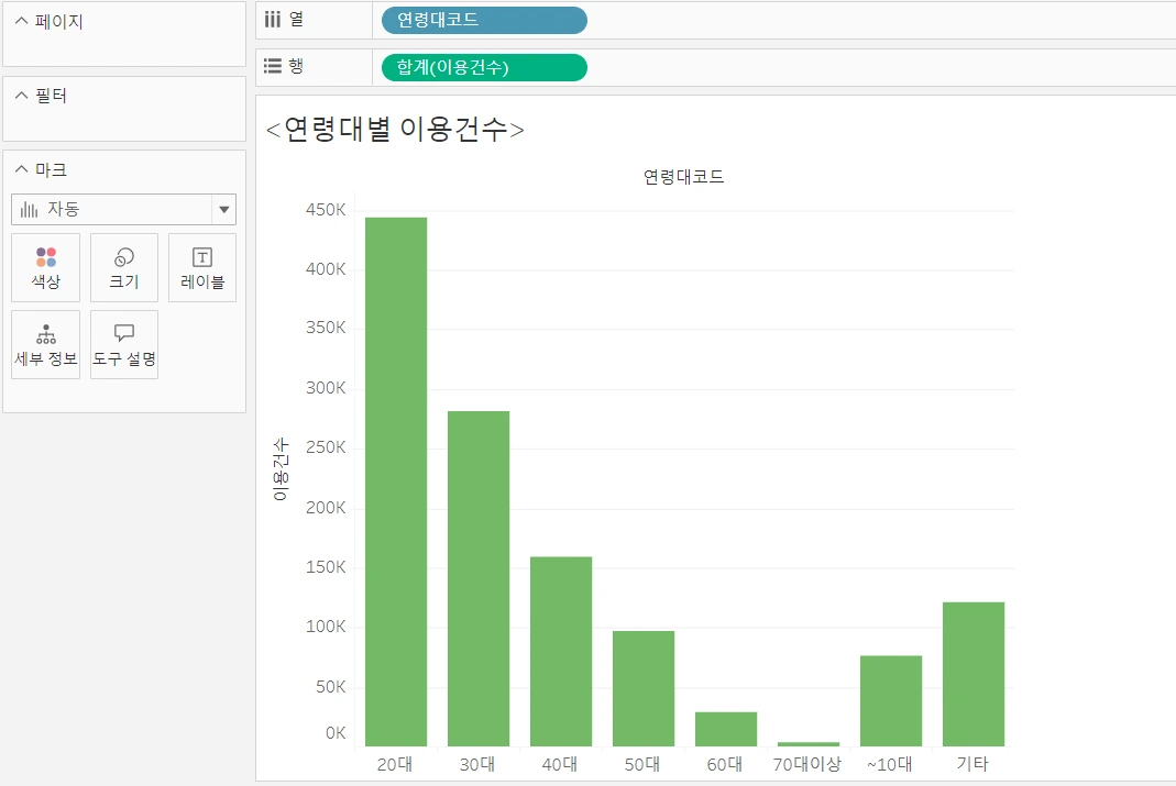 연령대 정보를 받지 못한 기타 이용 건수를 제외한 전체 이용 건수( 1,089,682건)에서 20대의 이용건수(443,711건)은 전체의 40.1%를 차지한다. 따라서 따릉이의 주사용층은 2030이 맞다. -> True