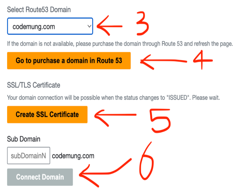그 다음 6번의 Sub Domain 명만 사용자에게 입력받아서 Connect Domain 버튼을 누르면 https:// 로 해당 서브도메인으로 Route53에 연결까지 완료가된다.