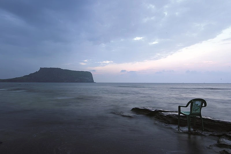 내가 묵은 민박집에서 100여 미터 떨어진 곳이었을까. 해안가가 펼쳐지며 바위 위에 플라스틱 의자 하나가 덩그러니 있었다. 그렇게 홀린 듯 그곳으로 걸어갔다. 가면 갈수록 바닷물은 잔잔히 신고 있던 슬리퍼를 적셔오기 시작했다. 이윽고 초록빛 낡은 의자에 앉고서는 다시금 하늘과 바다의 길을 바라보았다. 걸어오는 그 몇 분 사이 선홍빛 풍경이 다홍색으로 바뀌고 있었다. 그리고 서서히, 아주 서서히 먹구름 떼 사이로 고개를 내미는 무언가.