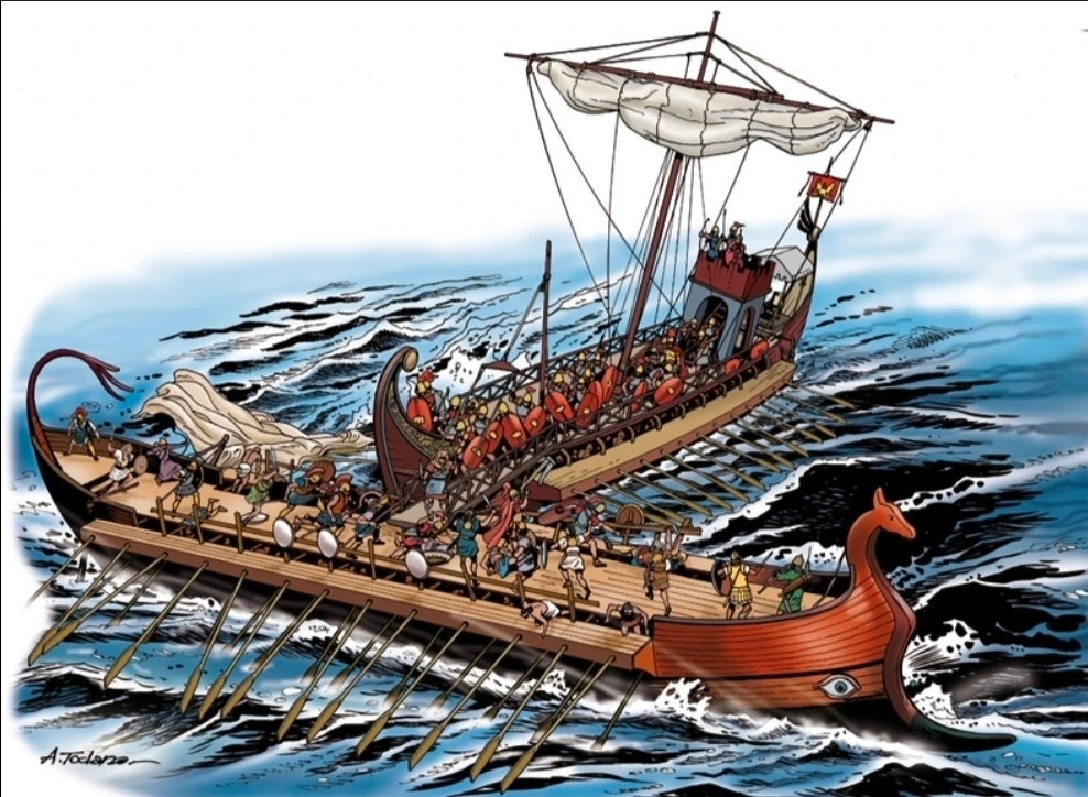 이탈리아의 해안선은 유럽에서 가장 긴 축에 속한다. 만과 반도가 교차하고, 모나코와 접경인 리구리아 해안에서 최남단의 시칠리아까지 작은 항구와 큰 항만이 파도 속에 숨듯 이어진다. 고대 로마는 이 해안선을 병영 삼아 포에니 전쟁을 치렀다. 포에니 전쟁은 기원전 264년부터 146년까지 로마와 카르타고가 지중해 패권을 놓고 벌인 전쟁이었다. *트리레임이라 불린 전투 갤리선을 띄운 로마는 ‘코르부스(Corvus)’라는 접이식 다리를 달았다. 이 다리를 적선에 걸고, 바다 위에서 육상전처럼 싸웠다. 이 전쟁은 로마가 지중해를 '로마의 바다(Mare Nostrum)'로 부르게 한 계기가 되었고, 군사력과 특징적 지리가 결합하면 얼마나 강력해 지는지 처음으로 보여줬다.