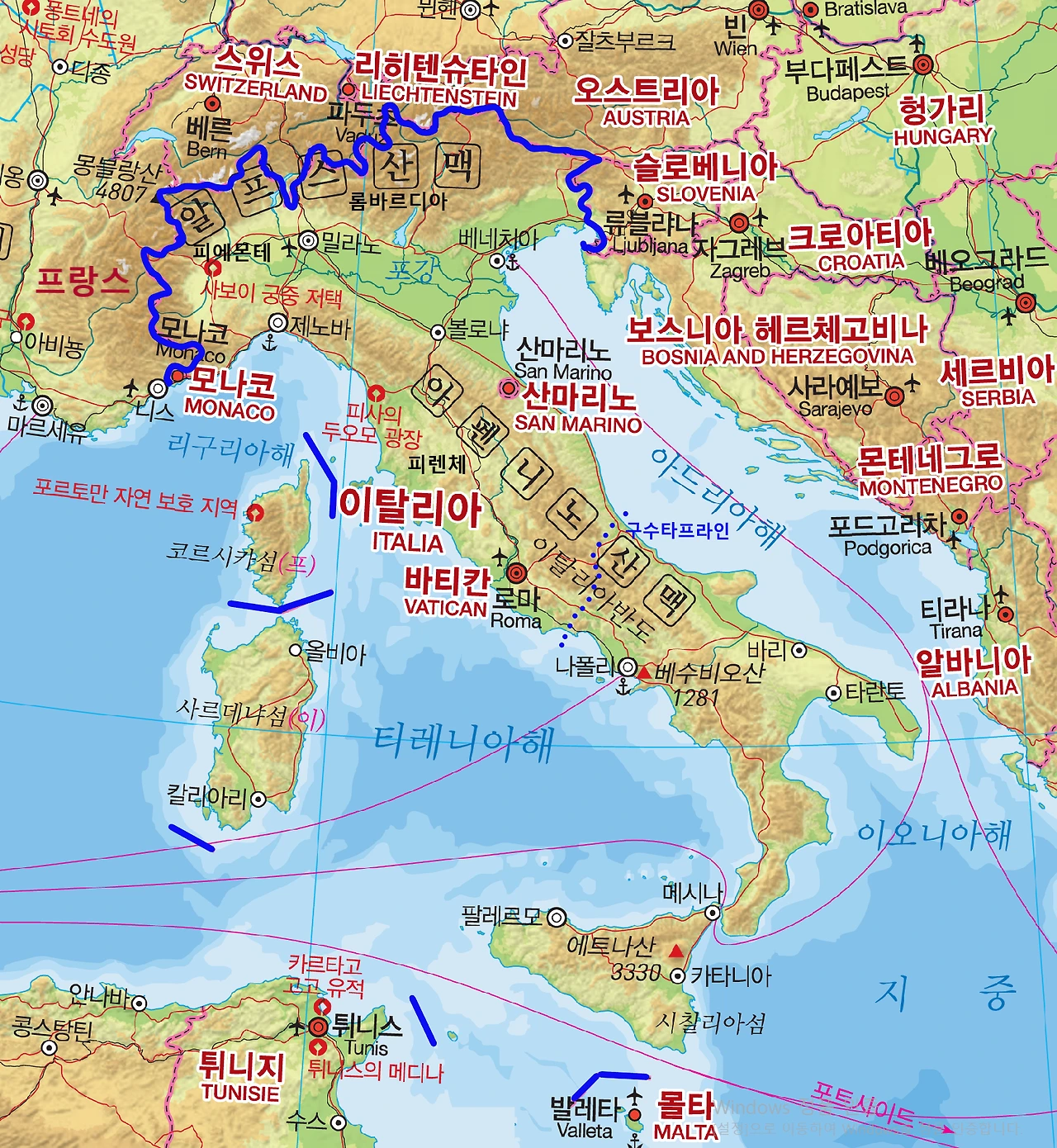 멀리서 보면 이탈리아는 바다 위에 반쯤 빠져나온 한 자루의 긴 칼날 같다. 북쪽은 알프스라는 단단한 손잡이에 걸려 있고, 남쪽은 지중해 깊숙이 잠겨 있다. 아드리아해와 티레니아해가 반도의 좌우를 부드럽게 감싸고, 남쪽 끝자락엔 시칠리아와 사르데냐 같은 섬들이 바람과 파도의 요새처럼 떠 있다. 이 길고 굽은 지형은 고대부터 오늘까지 수많은 전쟁을 불러왔고, 수많은 평화를 다시 꿈꾸게 했다.