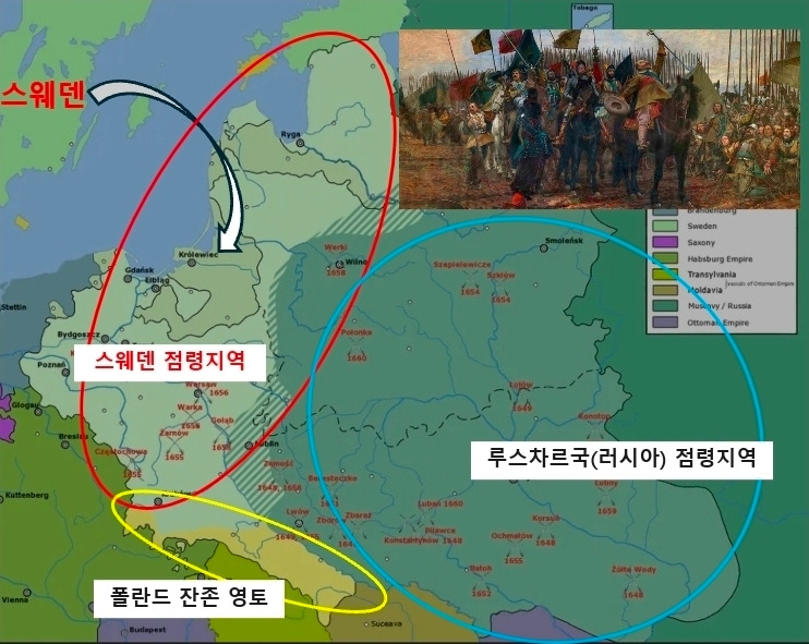 17세기, 스웨덴과의 전쟁은 그 대표적 사례였다. 발트해 패권을 둘러싸고 폴란드와 스웨덴은 끊임없이 충돌했다. 특히 폴란드의 ‘대홍수 시대(Deluge)’라 불린 1655~1660년의 북방 전쟁은 폴란드를 폐허로 만들었다. 스웨덴 군은 기동성과 해군력을 앞세워 폴란드를 초토화했지만, 결국 게릴라적 저항과 외부 세력의 개입으로 물러났다. 이 전쟁은 발트해 패권 다툼이 단순한 국경분쟁이 아니라, 유럽 전체 세력 균형을 흔드는 문제임을 보여주었다.