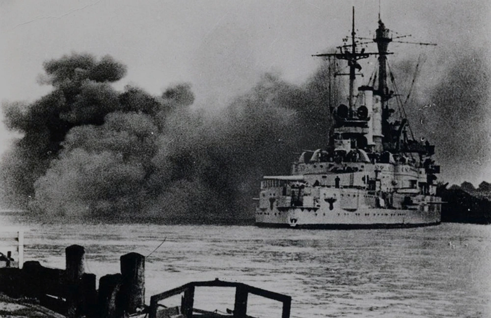 폴란드 베스테르플라테를 포격 중인 독일의 슐레스비히 홀슈타인 전함(1939년)