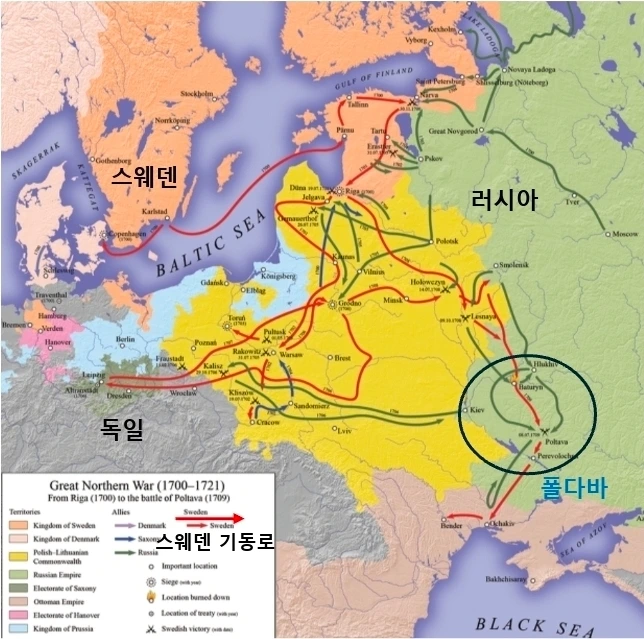 그러나 자연은 동시에 제국의 한계를 드러냈다. 1700년부터 발트해의 지배권을 놓고 진행된 대북방 전쟁 중 하나로 1709년 우크라이나 지역 폴타바 전투에서 스웨덴은 러시아의 광활한 대지와 혹한에 무너졌다. 기동력과 화력을 자랑하던 군대는 끝없는 평야와 겨울에 갇혀 괴멸당했다. 이 패배는 스웨덴 제국의 쇠퇴를 알렸고, 발트해의 패권은 러시아로 넘어갔다. 자연은 승리를 주기도 했지만, 패배의 무덤이 되기도 했다.