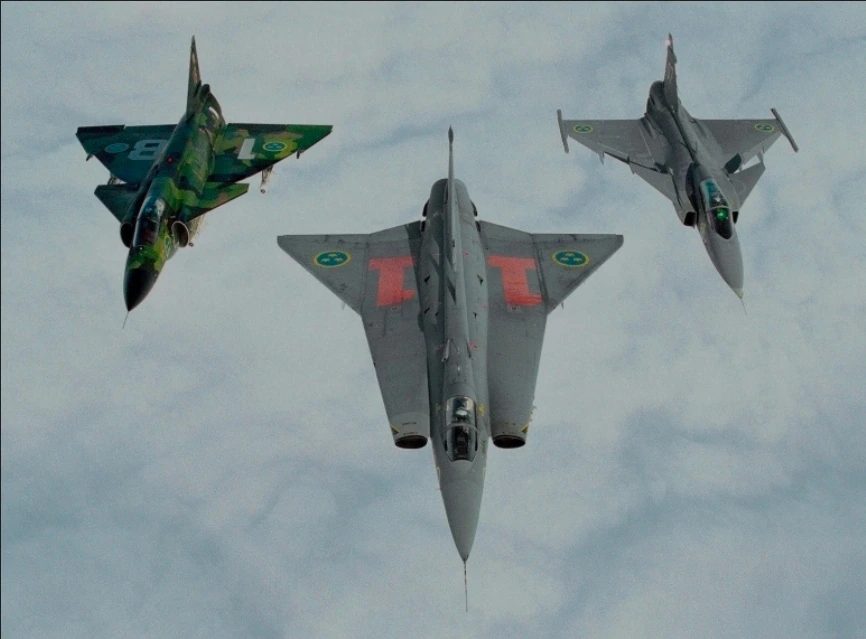 좌측부터 스웨덴 사브의 JSS-37 Viggen, JAS-35 Draken, 그리고 JAS-39 Gripen
