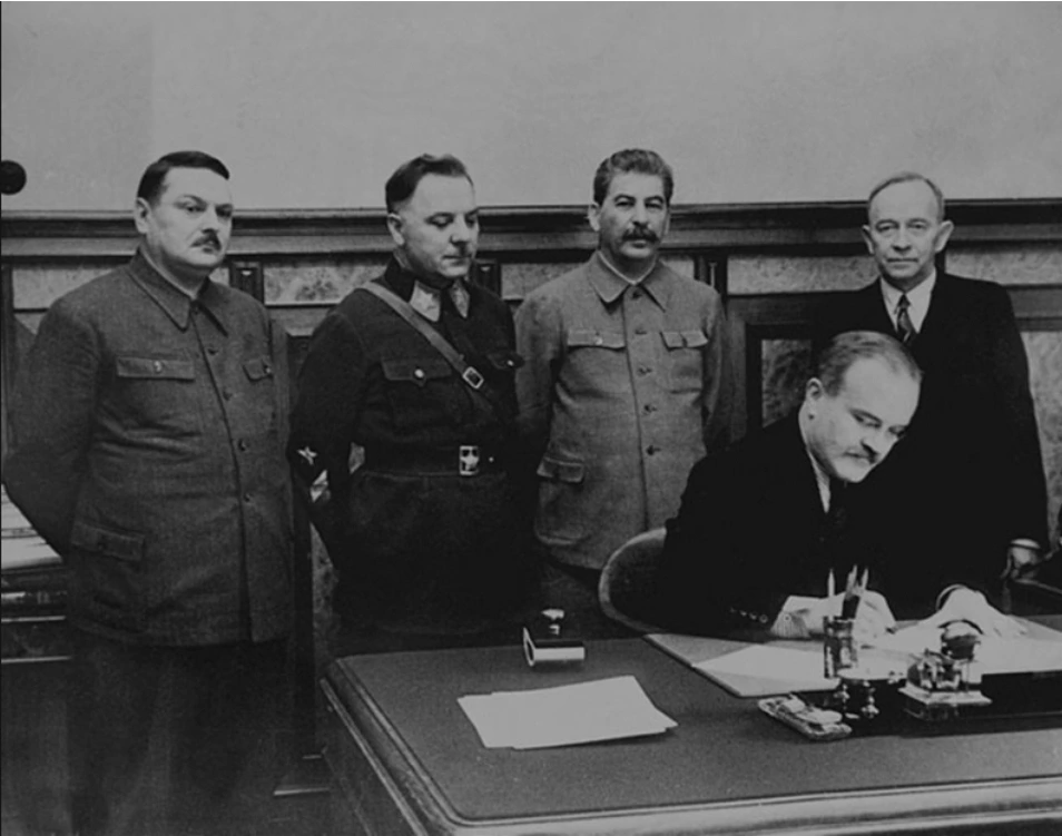 친 소련의 민주공화국과 협정 조인식(뒷열 소련의 수뇌부와 핀란드 수반 쿠시넨(우측끝, 매국노로 평가 받음))