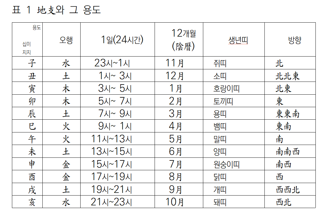 다음은 12지의 오행과 시간 구분과 1년 12개월의 월건과 년마다의 12지 표기법과 방향을 도표로 작성한 것이다.