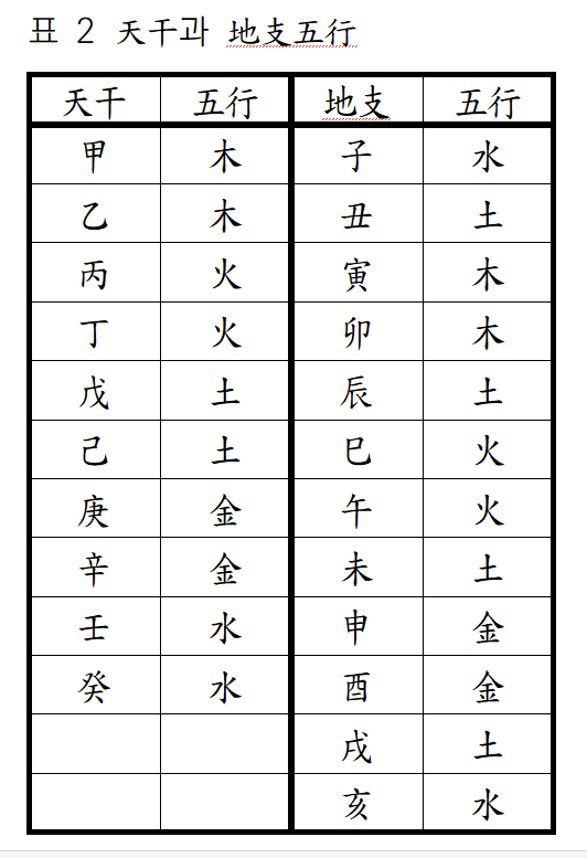 다음은 천간과 지지의 오행을 각각 도표로 작성한 것인데 이는 고정적인 것으로 기억해 두면 쓸모가 많다.