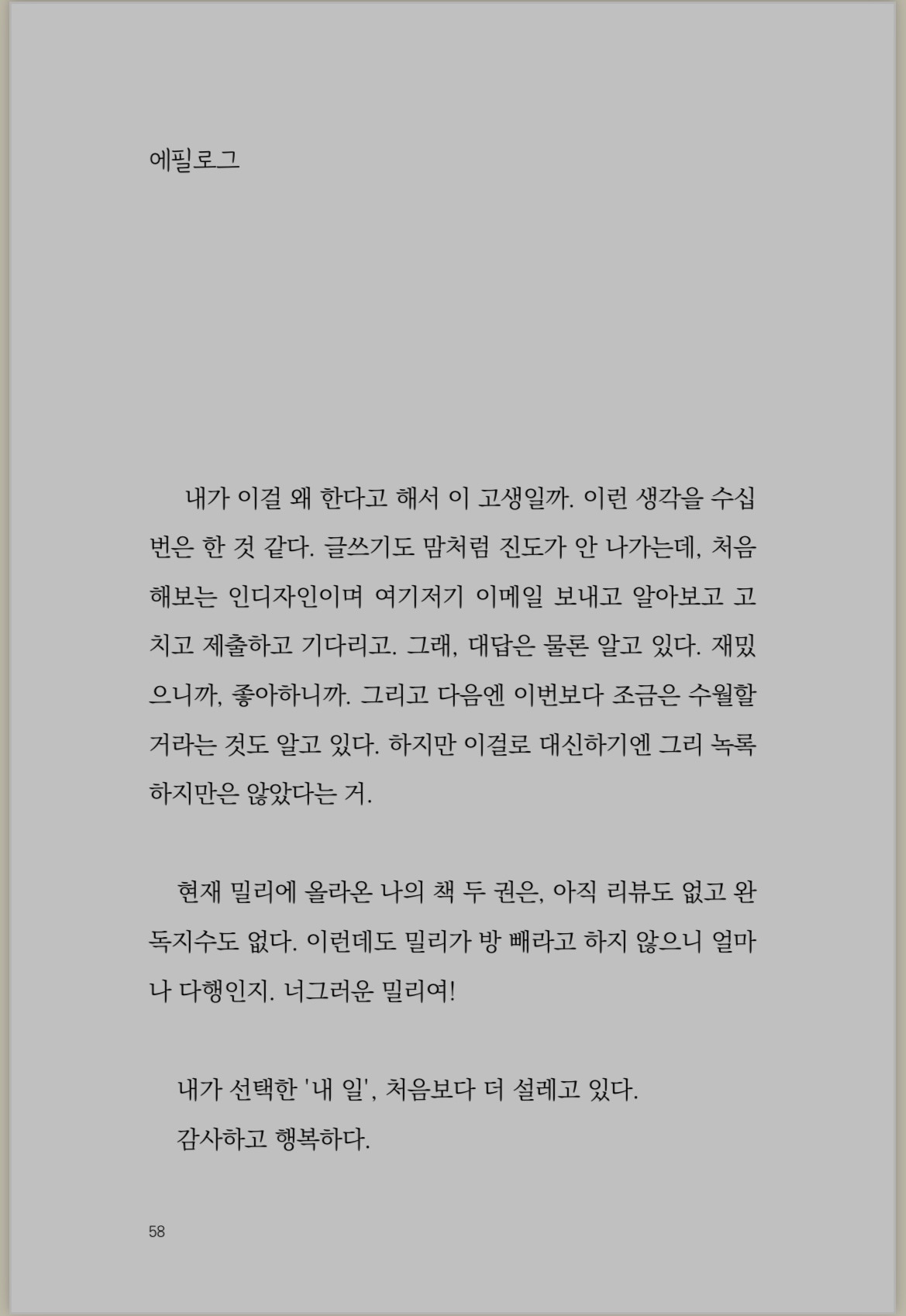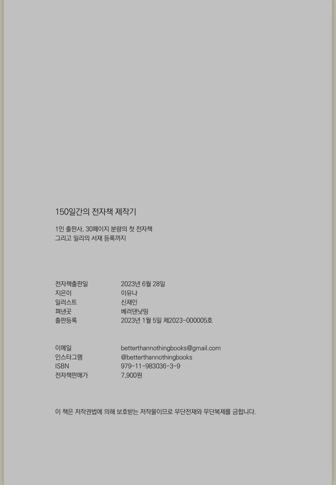 처음 제목은 '150일간의 전자책 제작기'가 아니었다. '전자책 출산기'였던가. 정말 내 심정 그대로였다. '출산'에 버금가는 일이었다. 때려치우고 싶기도 했고, 이게 맞나 싶기도 했고. 생각보다 오래 걸린 이유는 퇴고였다. 진짜 마지막 퇴고라 생각하고 건방지게 브런치에 글을 올렸다. 여기 올리고 나면 더 이상 고치지 말자고. 그러다 어느 날 프롤로그를 다시 읽는데 엉망이었다. 프롤로그 한 문장을 고치니 그다음도 그다음도. 다 마음에 들지 않았다. 결국 포기. 다시 손을 대는 데까지 정말 오래 걸렸다. 그러다 브런치에 올리던 제작기도 중단. 교만하게 쉽게 마지막이라고 글을 올리는 일은 다신 없겠지. 호되게 배웠다.
