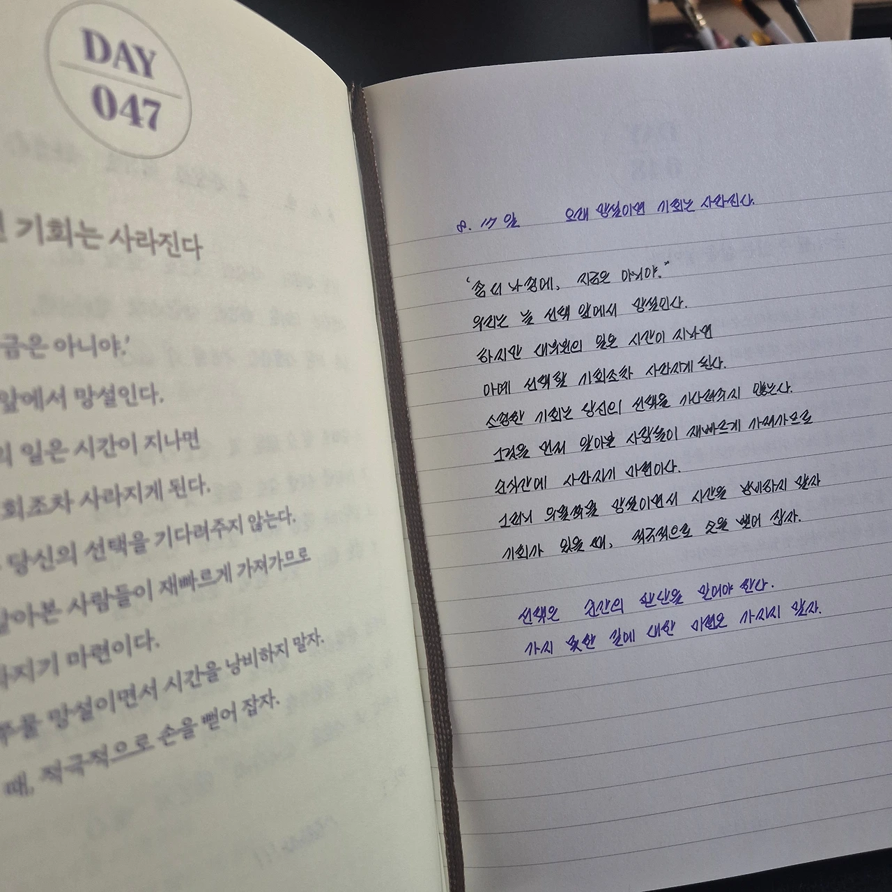 나의 하루는 필사와 감사 일기로 시작한다. 그리고 같은 방향을 향해 가고 있는 이들에게 건네는 아침 인사로 이어진다. 짧은 한마디라 해도 순간만큼은 진심을 담은 마음의 정성이기에, 그것이 습관으로 자리 잡은 지금은 오히려 나 자신이 위로받고 있음을 느낀다.