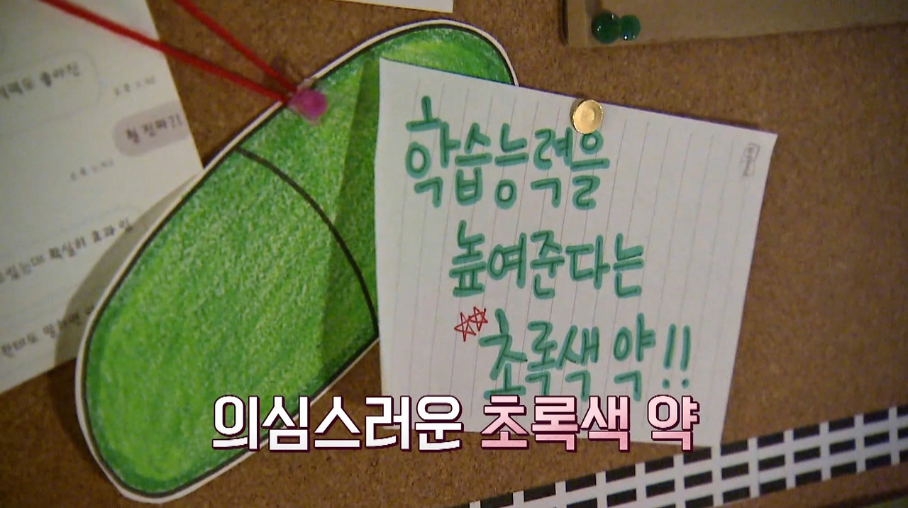 학생들은 초록 알약을 먹으면 공부를 잘할 수 있다는 사실에 이를 먹는다. 그리고 이 초록 알약은 공부를 잘하고 싶다는 욕망을 의미한다. 즉, 초록 알약은 S반과 동일시되는 욕망의 개념이고 이는 실제 사회에서 일어나는 이데올로기의 결과물이다. 초록색이 주는 상징적 의미는 일반적으로 생명과 평화로 알려져 있다. 그러나 초록색은 미성숙의 의미를 지니기도 한다. 이는 이데올로기 속에서 학생들을 미성숙한 존재로 여기는 시선을 의미하기도 하고, 미성숙한 존재가 될 수밖에 없는 학생들 자체를 상징하기도 한다.