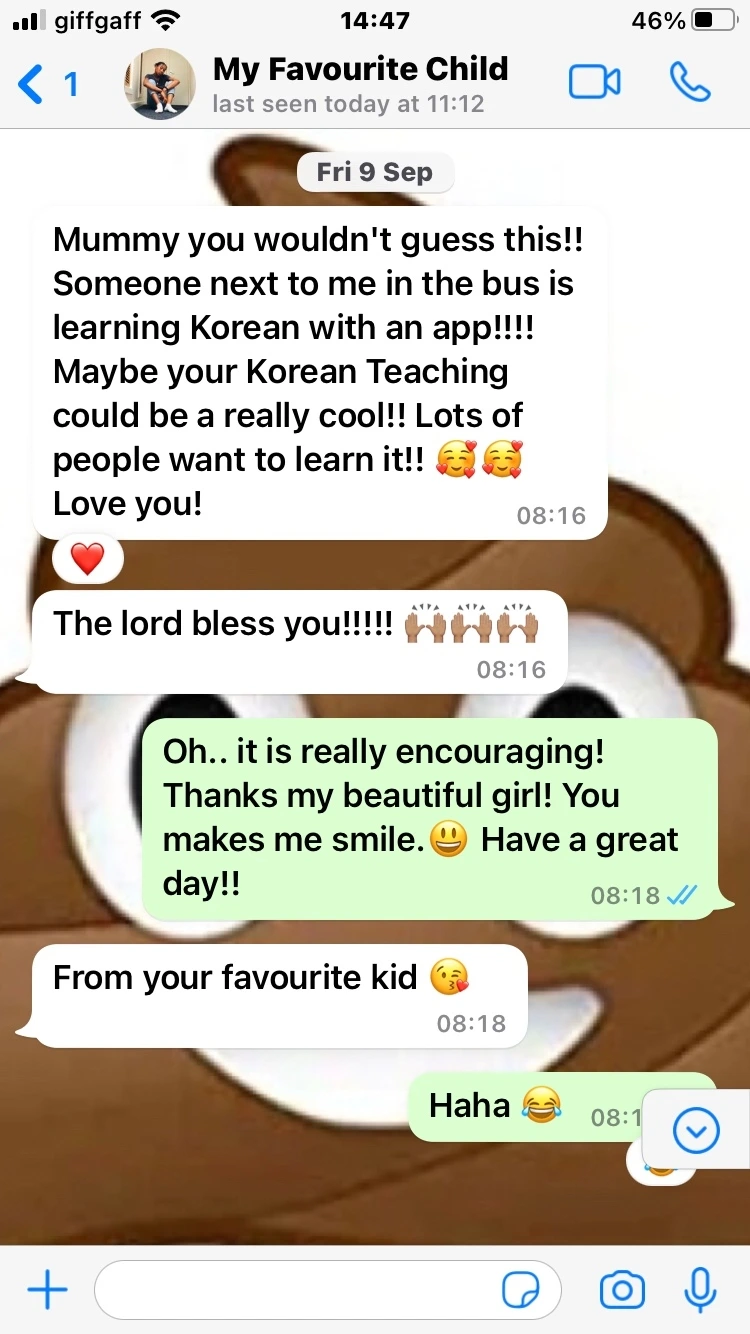 버스에서 제 옆에 앉은 누군가가 핸드폰 앱으로 한국어를 공부하고 있어요. 엄마가 한국어를 가르치면 멋있을 거예요. 많은 사람들이 배우고 싶을 거고요. 사랑해요"