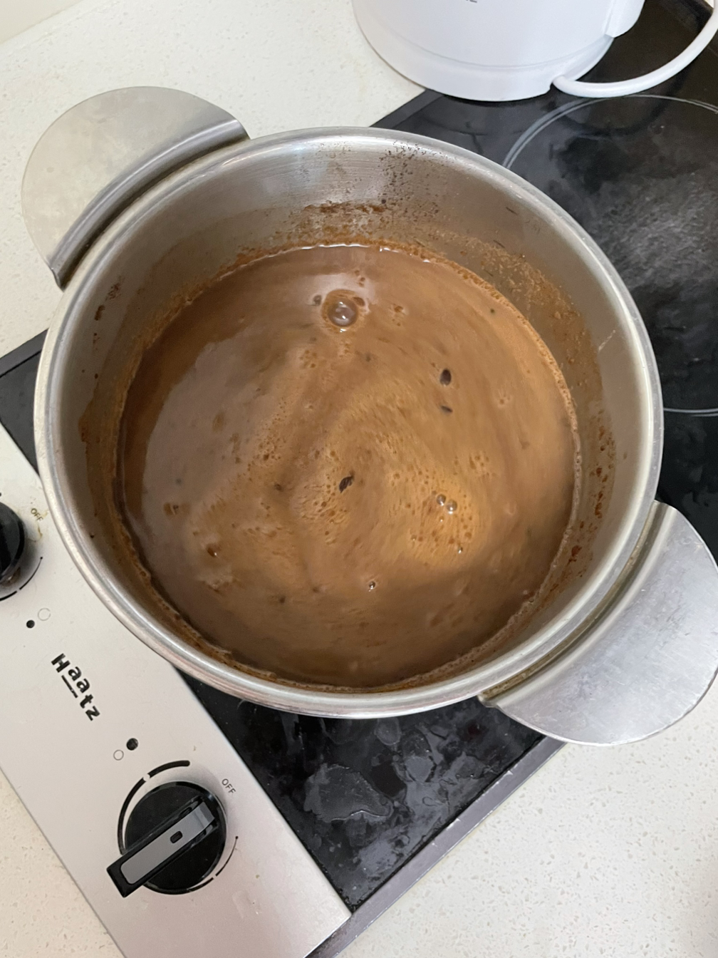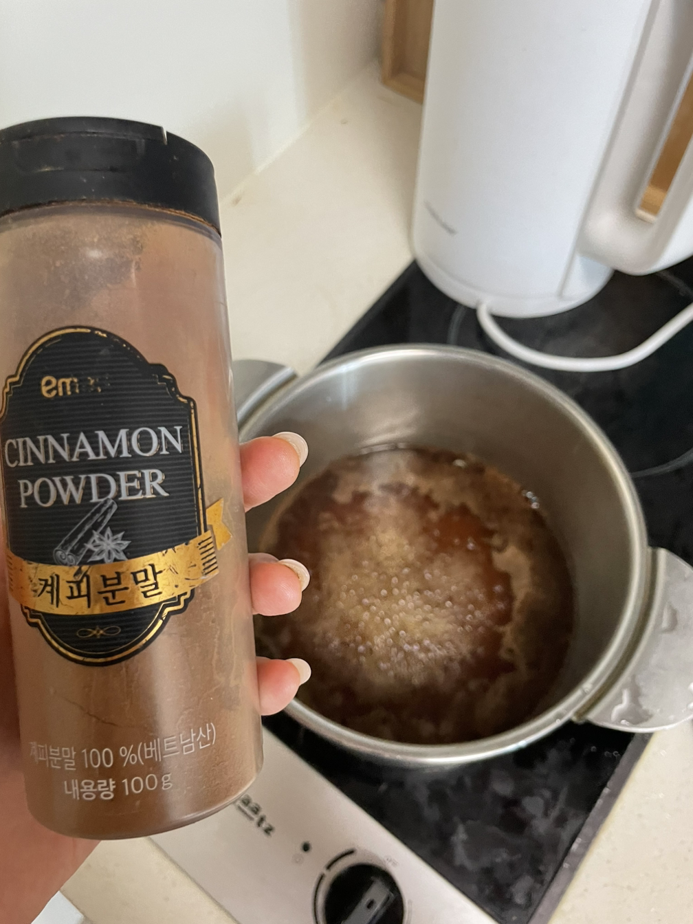 냄비에 물과 커피가루를 넣고 그다음에 감칠맛을 내기 위해서 계핏가루를 추가했다. 3분 정도만 지나면 냄비가 펄펄 끓기 시작한다. 잘 저어주다가 2분 정도 지났다가 두유를 두 컵 정도 넣고 조렸다.