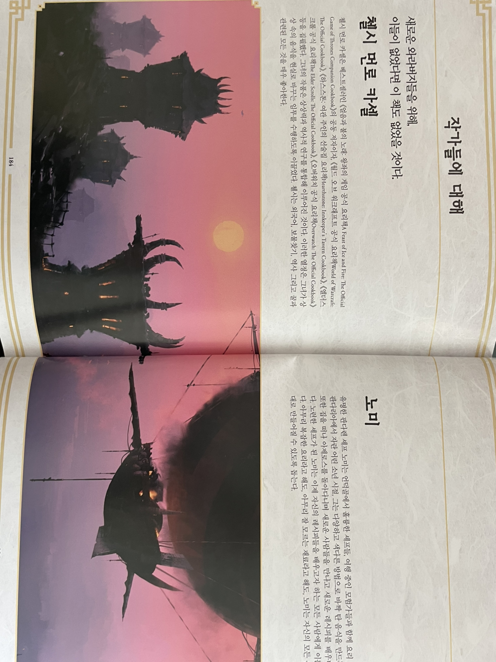 월드 오브 워크래프트에는 노미라는 판다곰처럼 생긴 요리사라는 게임 캐릭터가 등장하는 공식 요리책2는 독특하다. 우선 요리책 제목부터 심상치가 않다. 조심스럽게 첫 페이지를 펼치면 가장 먼저 노미가 요리를 배우고 느꼈던 일들과 여행자들의 이야기가 나온다. 그 뒤로부터는 독자들에게 맛있는 음식을 만드는 방법을 설명해주면서 감각적인 욕구를 자극하게 만든다. 여기에 아제로스 최고의 음식들을 직접 만들어보는 재미를 더한 책~!