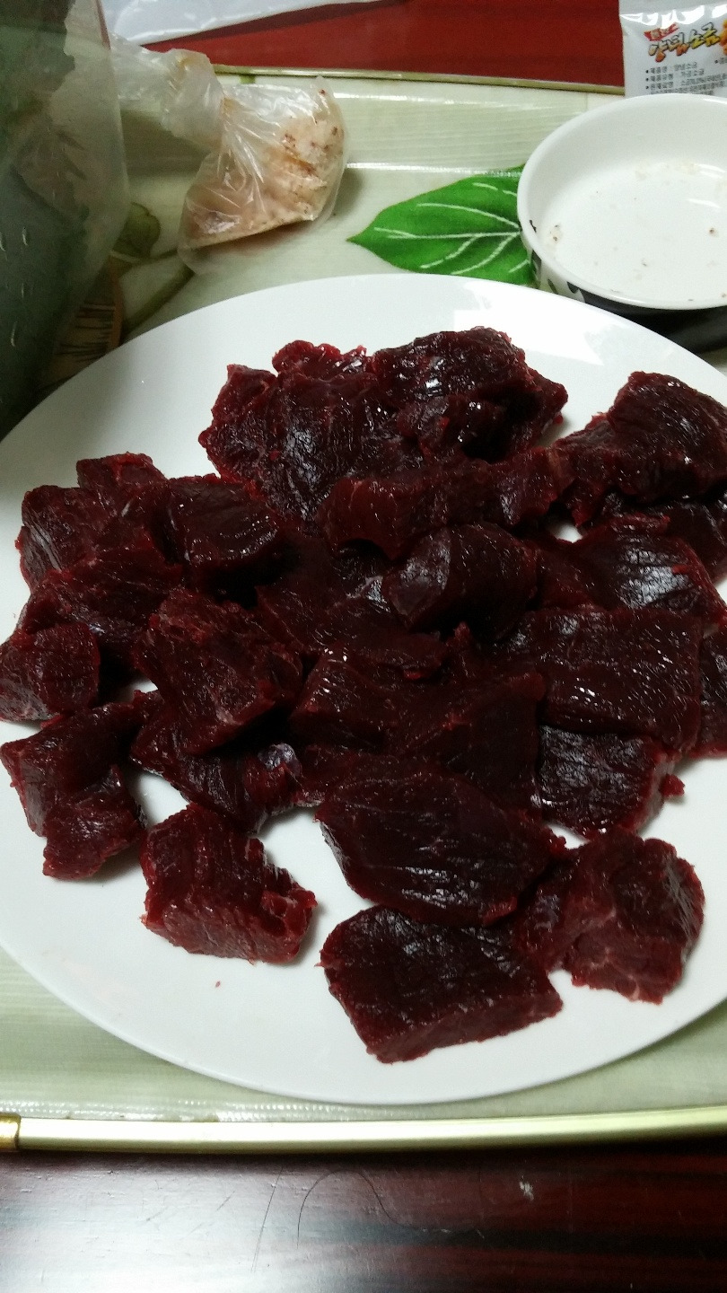 요즘 인터넷에는 없는 게 없다. 뭉티기 양념도 파는 곳이 있다. 중요한 재료인 고추다대기를 파는 곳을 발견했다. 생마늘을 찧고 다대기를 넣고 참기름을 끼얹어 양념장을 만들고 우둔살을 썰었다. 근막을 제거하고 부드러운 부분을 그야말로 뭉텅뭉텅 썰었다.