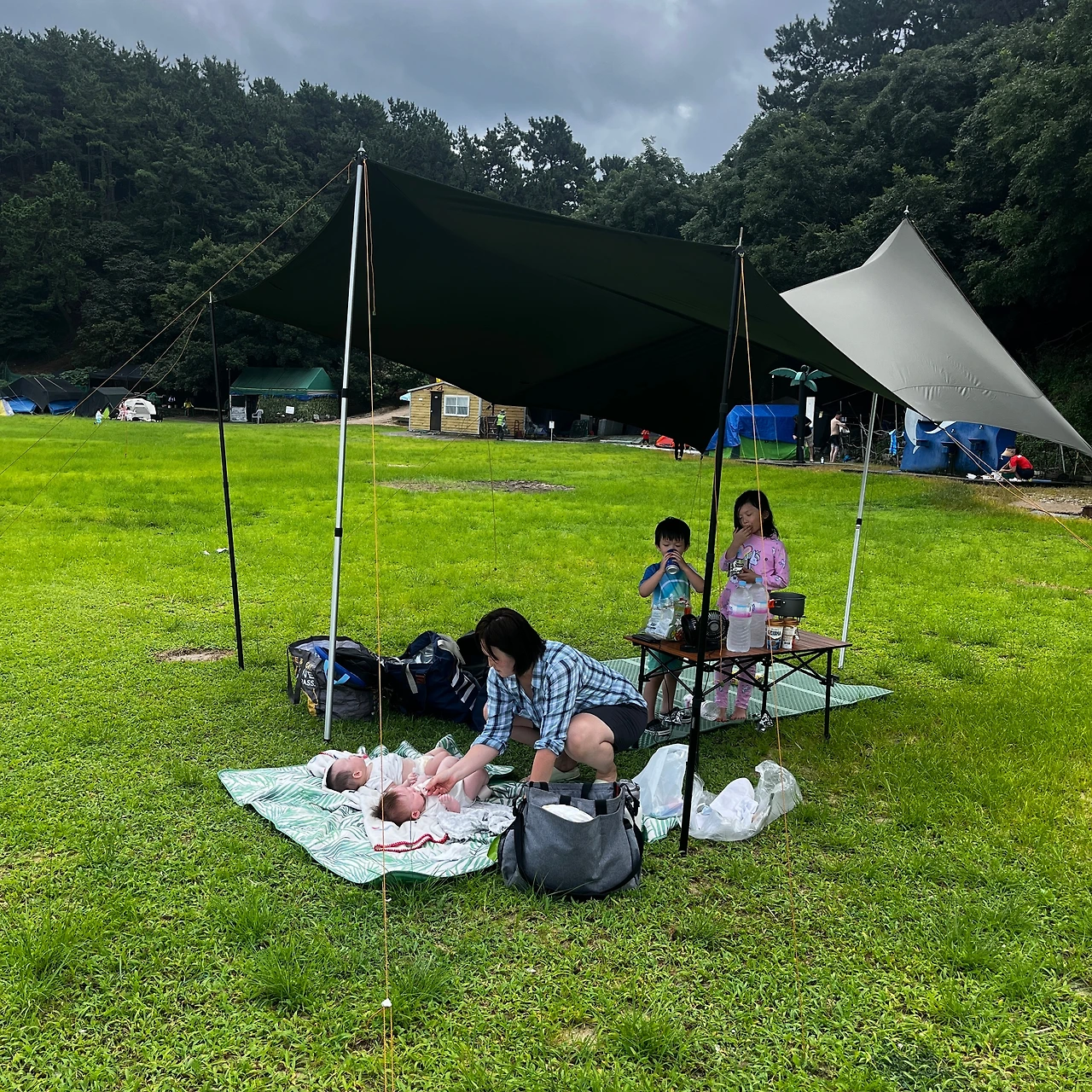 7월 습기 차고 더운 날, 구름이 많은 날이기도 했지만 가끔 햇빛이 나올 때가 있어서 쌍둥이들을 데리고 그늘만 찾아다니며 햇빛을 최대한 안 맞게 하려고 최선을 다했다. 그런데 타프가 자외선을 막지 못했는지, 중간중간 1-2분 햇빛을 본 것이 탈이었는지 모르겠지 집에 돌아오니 쌍둥이 얼굴이 시뻘겋게 탔다. 급하게 아기용 수딩젤을 구매했고 비판텐이랑 섞어서 시간 날 때마다 발라주니 다행히 3일 지나 껍질이 벗겨지고 7일이 지나니 다행히 얼굴이 다시 뽀얗게 돌아왔다.