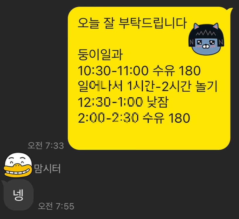 수유시간, 수유량, 대변유무, 낮잠시간이다. 이 외에 구두로 아이의 건강상태에 대해서 대화를 나눌 수 있다.